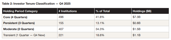 투자자 구성에서도 뚜렷한 특징이 나타났다. 4개 분기 연속 보유한 핵심 투자자는 496개로 전체의 41.8%에 불과하지만 73억 달러를 보유하며 전체 자산의 68.2%를 점유했다. 반면 2개 분기 보유 중간 투자자는 407개로 34.3%를 차지하며 향후 핵심 투자자로 전환될 가능성이 높은 대기 자금으로 평가된다. 3개 분기 보유 투자자는 155개, 신규 단기 투자자는 221개로 나타나 장기 자본과 단기 자금이 동시에 유입되는 구조가 형성됐다.