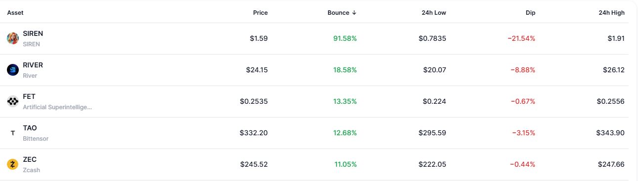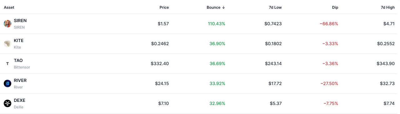 [편집자주] 급락 이후의 되돌림 흐름은 단기 매수세 유입 여부를 가늠하는 하나의 힌트가 될 수 있다. '저점(Dip)'은 최근 7일 최저가를, '반등(Bounce)'은 해당 저점 대비 상승률을 뜻한다. 이를 통해 기술적 반등 흐름과 시장의 수요 반응을 함께 살펴볼 수 있다. 조정 구간 이후 가격이 눈에 띄게 회복된 종목은 다음 추세 전환 가능성을 시사할 수도 있다. 반복적으로 나타나는 가격 패턴을 바탕으로 반등 흐름이 감지되는 자산을 소개한다.