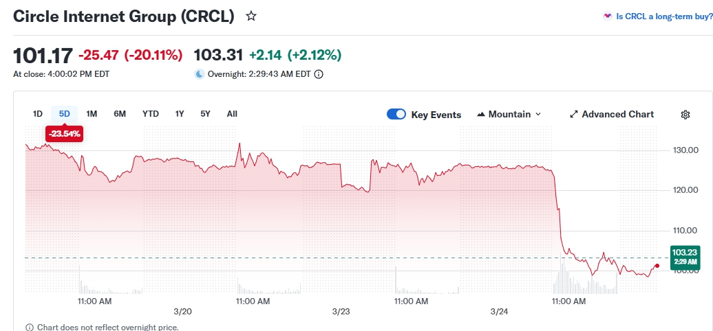 서클 주식(NASDAQ: CRCL)은 이날 약 100달러 선에서 거래되며 20% 하락 마감했다. 미즈호(Mizuho) 애널리스트들은 하락의 핵심 원인으로 초당파 스테이블코인 입법 초안을 지목했다.