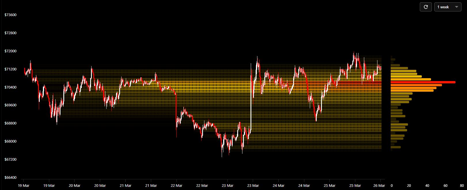 24시간 히트맵에서는 거래 집중 구간이 7만500달러~7만1500달러로 명확히 내려온 것이 확인된다. 이는 시장 참여자들의 평균 체결 단가가 하향 이동했음을 의미하며, 현재 가격 역시 이 구간 내에서 움직이며 새로운 단기 박스권을 형성하고 있다.