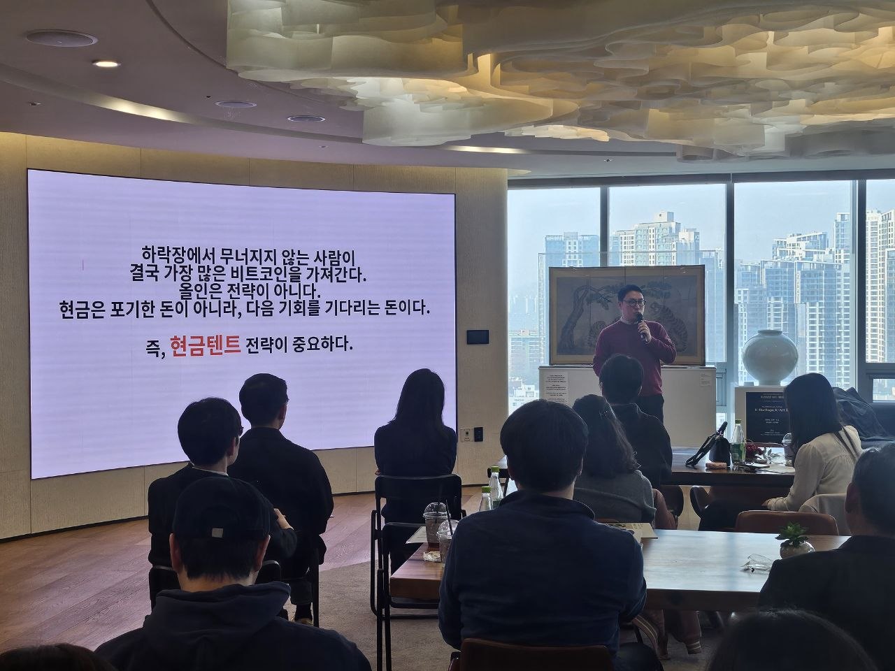 마지막 발표자는 이장우 업루트컴퍼니 대표였다. 통유리 너머 한강이 보이는 자리에서 그는 청중을 먼저 돌아봤다. 언제 비트코인을 처음 시작했냐고. 2017년, 2021년, 2022년, 작년. 다양한 손이 오갔다. 그 시작 시점 대부분이 공통적이었다. 가격이 급등해 '안 하면 안 배기는' 느낌이 들었을 때.