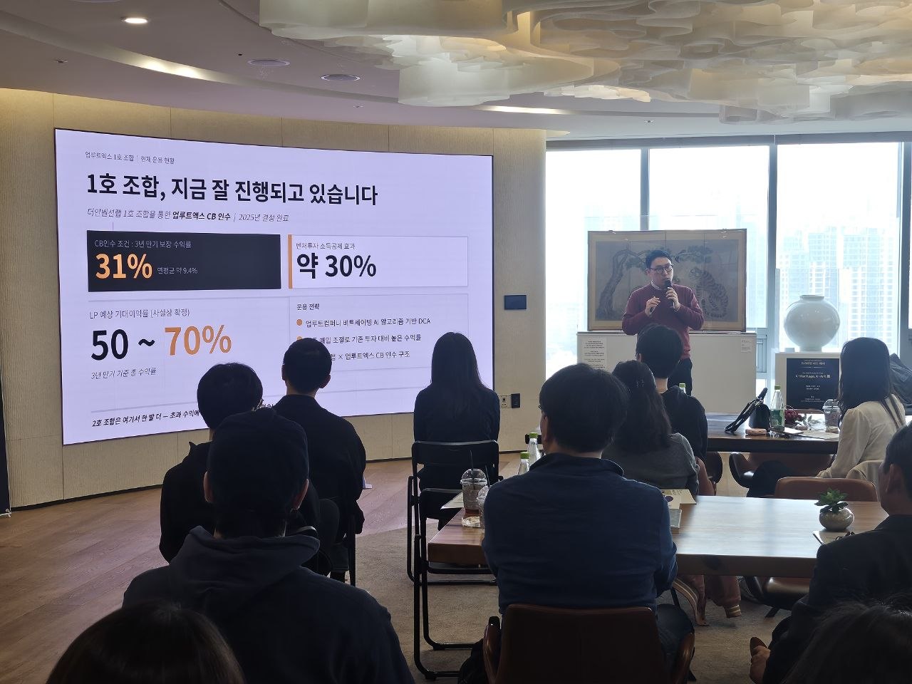 세 번째는 업루트X의 비트코인 적립식 전환사채(CB) 상품이다. 업루트컴퍼니의 자회사인 업루트X는 비트세이빙의 스마트 DCA 알고리즘을 활용해 비트코인을 적립식으로 매입하는 구조를 가져간다. 이 대표는 작년 더인벤션랩과 함께 1호 조합을 결성해 첫 CB 상품을 선보인 바 있으며, 이번 세미나에서 2호 조합을 공개했다. 3년 만기 상품으로 연평균 기대 수익률은 약 23%. 벤처기업 소득공제 혜택까지 더하면 보수적 시나리오 기준 65%, 일반 시나리오에서는 120% 이상의 수익률도 기대된다는 설명이었다. "비트코인이 사이클로 움직이는 자산인 만큼, 3년 뒤 하락장을 만나더라도 그간 쌓인 수익으로 비트코인을 더 많이 살 수 있는 포트폴리오 전략입니다."