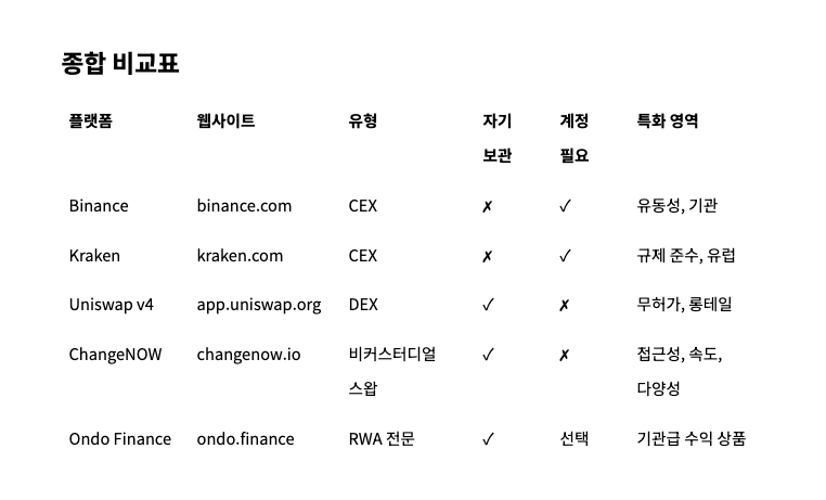그러나 RWA 토큰 시장은 아직 파편화된 구조를 유지하고 있다. 어떤 토큰은 규제 준수형 중앙화 거래소에서만 거래되고, 어떤 프로젝트는 DeFi 프로토콜을 통해서만 접근 가능하다. 또한 전통 금융과 온체인 DeFi의 경계에 걸쳐 있는 특수성 때문에 플랫폼 선택이 일반 크립토 투자보다 더욱 중요하다.