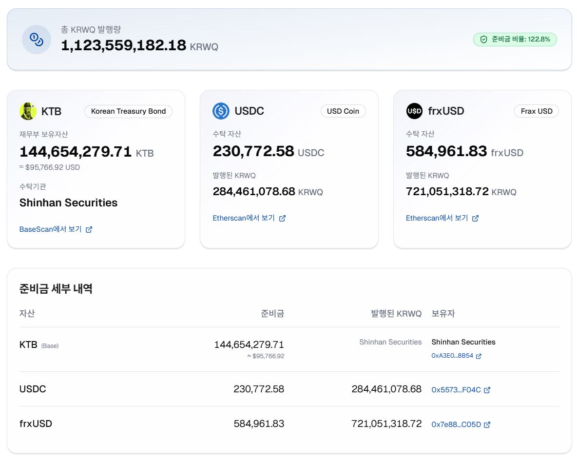 초기에는 USDC와 FraxUSD로 준비금을 구성했습니다. 제가 합류한 이후 다각화를 추진했는데, 현재 이더퓨즈(EtherFuse)와 신한을 통한 토큰화 한국 국채 매입, 홍콩 퍼스트디지털트러스트(First Digital Trust)를 통한 유로클리어 경유 국채 취득, 머니마켓펀드 토큰화를 추진 중인 국내 대형 증권사와의 협약(곧 발표 예정)이 준비됐습니다. 여기에 Chainlink의 Proof of Reserve 서비스도 곧 연동됩니다. 모든 데이터는 당사 웹사이트 투명성 섹션과 코인게코, 코인마켓캡에서 확인할 수 있습니다.