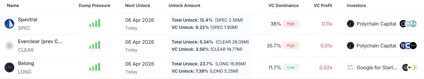 크립토랭크 집계에 따르면 4월 6일부터 12일까지 한 주간 락업 해제 규모는 약 5억9700만 달러 수준이다.