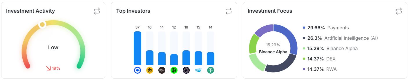 최근 30일 기준 투자 활동 지수는 전월 대비 19% 감소하며 ‘낮음(Low)’ 수준을 기록했다. 투자 건수와 자금 유입이 모두 둔화되면서 시장 전반의 투자 심리는 위축된 흐름을 이어가고 있다.