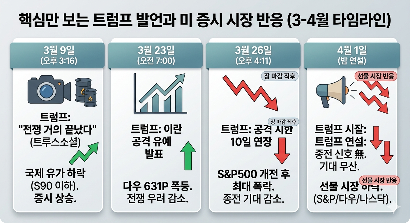 4월1일 밤 연설 — 시장은 이날 밤 연설에서 종전 신호를 기대했다. 그러나 기대가 무산되자 S&P500 선물은 약 1% 하락, 다우 선물 0.9%, 나스닥100 선물 1.1% 이상 하락으로 반응했다.