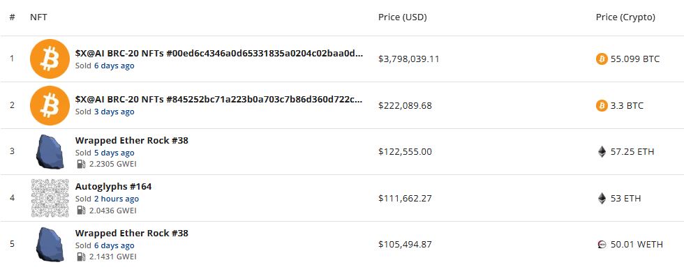 지난주 최고가에 거래된 NFT는 $X@AI BRC-20 NFTs #00ed6c...2bf0i0로, 379만8039달러(55.099 BTC)에 판매됐다.