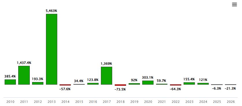스탯뮤즈에 따르면 최근 연간 수익률은 ▲2022년 –64.3% ▲2023년 155.4% ▲2024년 121% ▲2025년 -6.3%로 나타났다. 2026년 연초 대비 수익률은 -21.3%로, 전주(-24.6%) 대비 낙폭을 일부 축소했다.