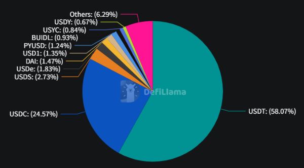스테이블코인 시장 점유율을 보면 1위 테더(USDT)가 1845억9400만 달러(58.07%)로 가장 높은 비중을 차지하고 있으며 2위 USD코인(USDC)은 781억2400만 달러(24.57%)로 뒤를 이었다.