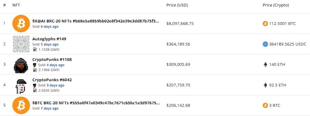 지난주 최고가에 거래된 NFT는 '$X@AI BRC-20 NFTs #b68e5a...2ffci0'로, 809만7669달러(112.5001 BTC)에 판매됐다.