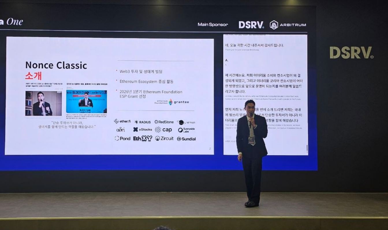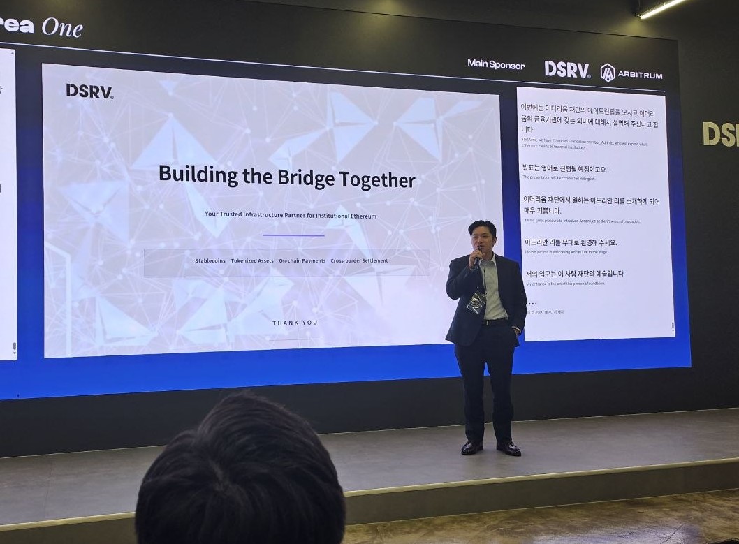 16일 오후 7시, 서울 DSRV 사옥 메인홀에서 'Ethereum Korea One — Bridging Institutions and the Ethereum Ecosystem'이 개최됐다. 미래에셋증권, KB증권, 한화증권, 카카오뱅크, 토스 등 국내 주요 금융기관과 이더리움 재단, 아비트럼, 옵티미즘 등 글로벌 프로토콜 관계자들이 한자리에 모인 이번 행사는 이더리움 코리아 컨소시엄(Ethereum Korea Consortium)의 공식 출범을 알리는 첫 무대로 평가된다.