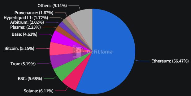 TVL 기준 체인 점유율을 보면 이더리움이 555억1700만 달러(56.47%)로 1위를 유지하고 있으며 ▲솔라나(60억800만 달러) ▲BSC(55억8000만 달러) ▲트론(51억 달러) ▲비트코인(50억6300만 달러) 순으로 뒤를 이었다.