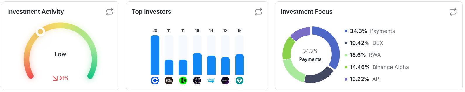최근 30일 기준 투자 활동 지수는 전월 대비 31% 감소하며 ‘낮음(Low)’ 수준을 기록했다. 투자 건수와 자금 유입이 동반 둔화되면서 시장 전반의 투자 심리는 위축된 흐름을 이어가고 있다.