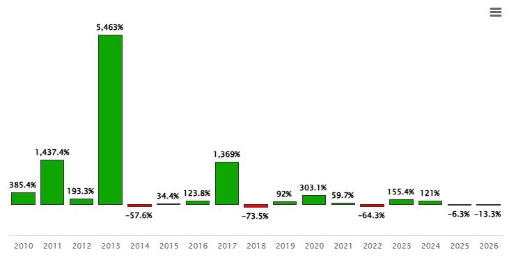 스탯뮤즈에 따르면 연간 수익률은 ▲2022년 –64.3% ▲2023년 155.4% ▲2024년 121% ▲2025년 -6.3%로 나타났다. 2026년 연초 대비 수익률(YTD)은 13.3%로, 전주(-19.15%) 대비 낙폭을 빠르게 만회하며 점진적인 회복세를 유지하고 있다.