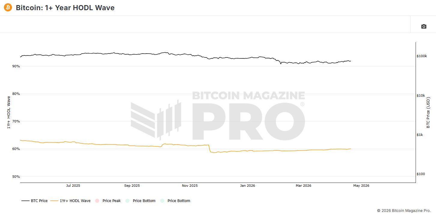 1+ Year HODL 웨이브 1년 이상 이동하지 않은 비트코인 물량의 비중을 나타내는 지표로, 장기 보유자 신뢰도와 매도 압력을 가늠하는 데 활용된다. 비중이 높을수록 장기 축적 경향이 강하다는 의미다.