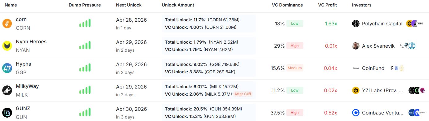 크립토랭크 집계에 따르면 4월 27일부터 5월 3일까지 한 주간 락업 해제 규모는 약 5억1400만 달러 수준이다. 가장 많은 해제가 예정된 시점은 5월 1일로 약 1억6900만 달러 규모의 물량이 집중될 예정이다.