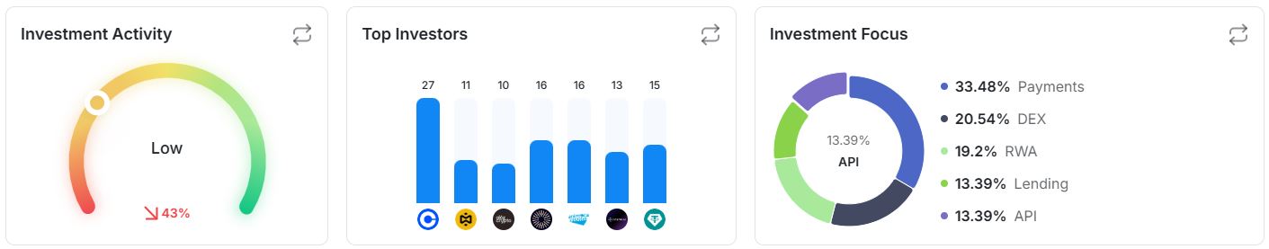 지난 6개월 기준 투자 비중이 가장 높은 분야는 결제로 33.48%를 차지했으며 이어 ▲DEX(20.54%) ▲RWA(19.2%) ▲렌딩(13.39%) ▲API(13.39%) 순으로 집계됐다.