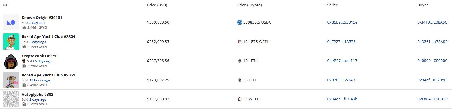 이어 ▲지루한 원숭이 요트 클럽(BAYC) #8824(28만2099달러, 121.875 WETH) ▲크립토펑크 #7213(23만7798달러, 101 ETH) ▲지루한 원숭이 요트 클럽(BAYC) #9361(12만3097달러, 53 ETH) ▲오토글리프 #302(11만7853달러, 51 WETH)가 뒤를 이었다.