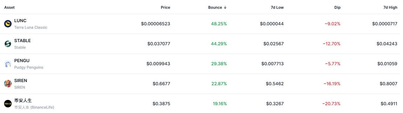 이어 스테이블(STABLE)은 약 44% 반등하며 0.02567달러에서 0.03708달러로 상승했고, 퍼지 펭귄(PENGU)은 약 29% 올라 0.007713달러에서 0.009943달러로 회복했다.