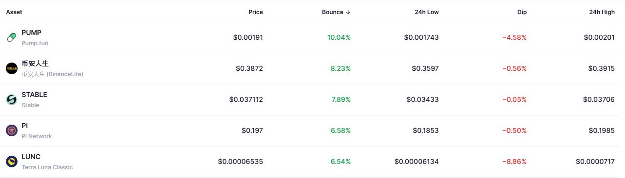 하루 동안 가장 큰 반등률을 기록한 자산은 펌프(PUMP)로, 일중 저점 0.001743달러에서 약 10% 상승해 0.00191달러까지 회복했다.