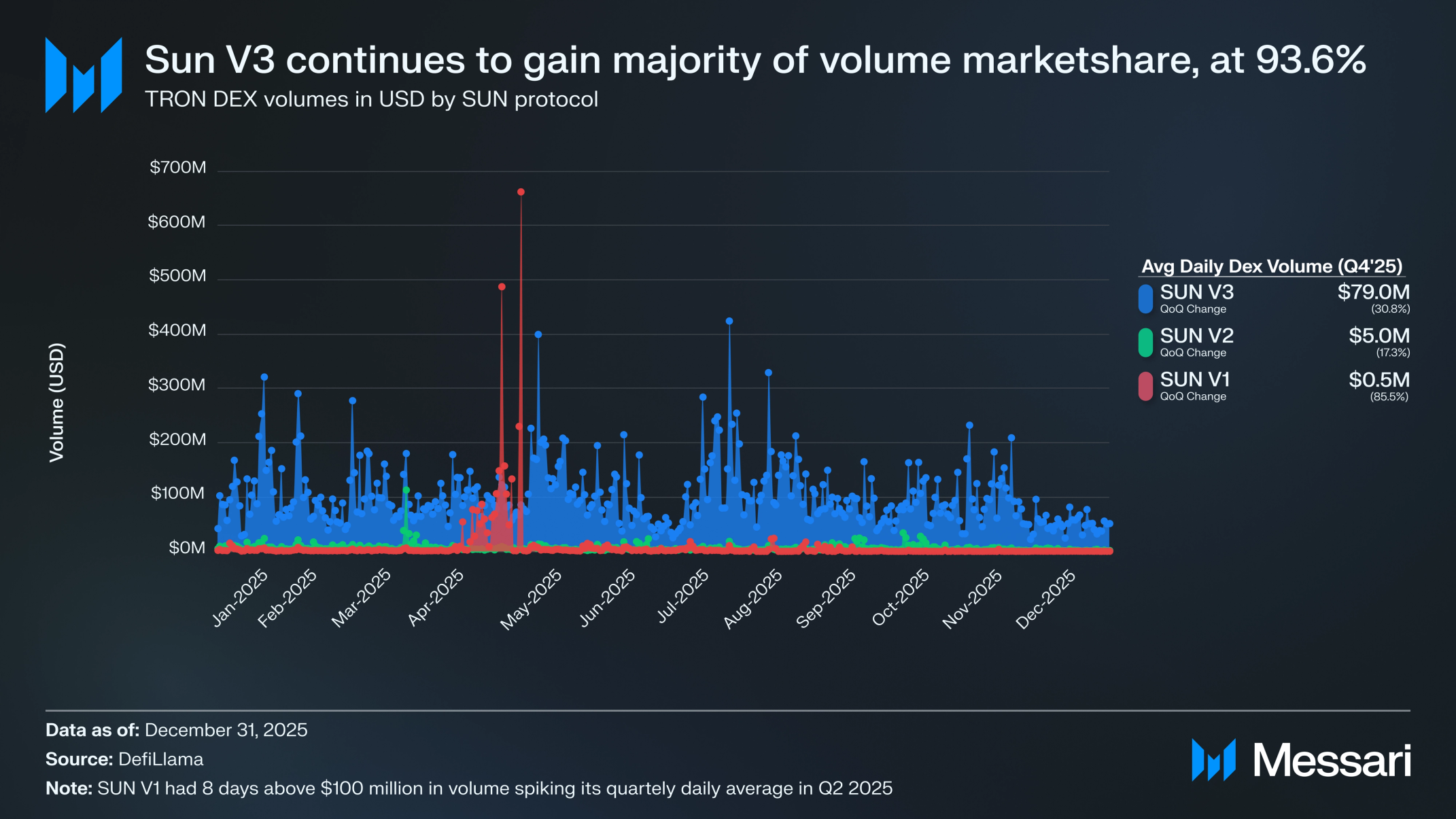 트론의 DEX 거래량의 대다수는 SUN 관련 유동성 장소에서 발생한다. 2023년 6월 SUN은 제품군에 집중 유동성(concentrated liquidity, CL) AMM(SunSwap V3)을 도입했다. 2024년 1분기는 선스왑 V3(SunSwap V3) 도입 이후 SUN의 거래량 대부분이 V3 AMM을 통해 라우팅된 첫 번째 분기였다. SUN V3는 2025년 4분기 트론 전체 거래량의 93.6%를 차지했다.