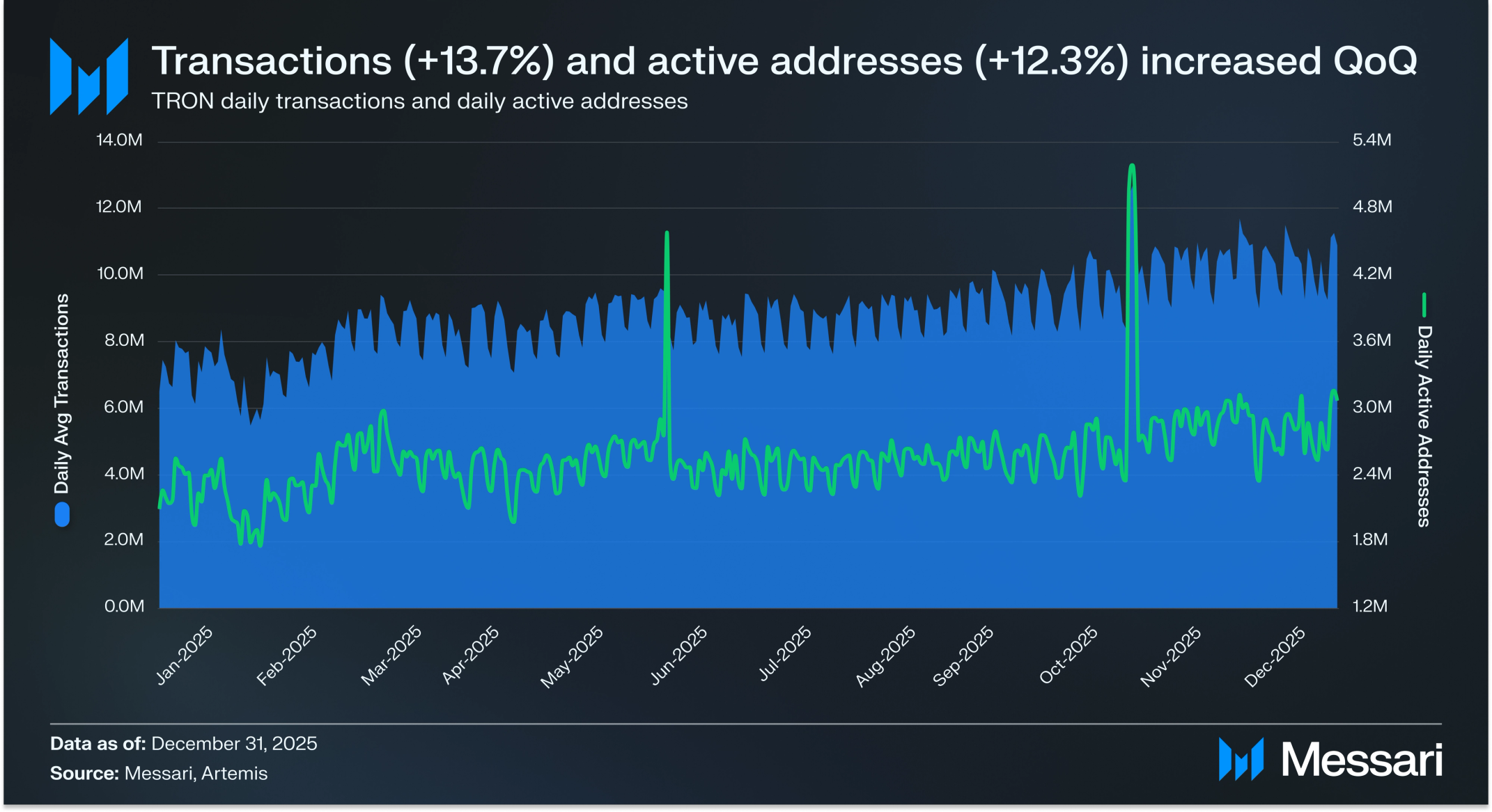 4분기 트론의 사용량은 긍정적이었으며, 일평균 거래량 및 일평균 활성 주소와 같은 온체인 활동 지표가 증가했다. 일평균 거래량은 전분기 대비 13.7% 증가하여 890만 건에서 1,020만 건으로 증가했고, 일평균 활성 주소는 전분기 대비 12.3% 증가하여 250만 개에서 280만 개로 증가했다.