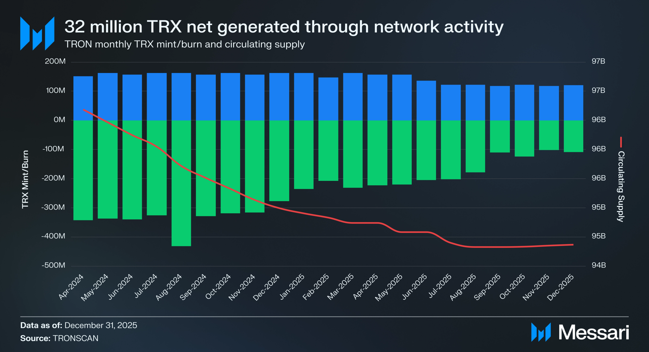 TRX의 유통 공급량은 주로 두 가지 매개변수에 영향을 받는다: (i) 스테이커와 블록 생산자에게 보상하기 위해 발행되는 토큰, (ii) 네트워크 거래 수수료로 인해 소각되는 토큰. 슈퍼 대표와 스테이커에게 분배되는 블록 및 투표 보상으로 매일 약 390만 TRX가 발행된다. 따라서 평균적으로 매일 390만 TRX 이상이 소각되면 유통 토큰 공급량은 시간이 지남에 따라 감소한다.