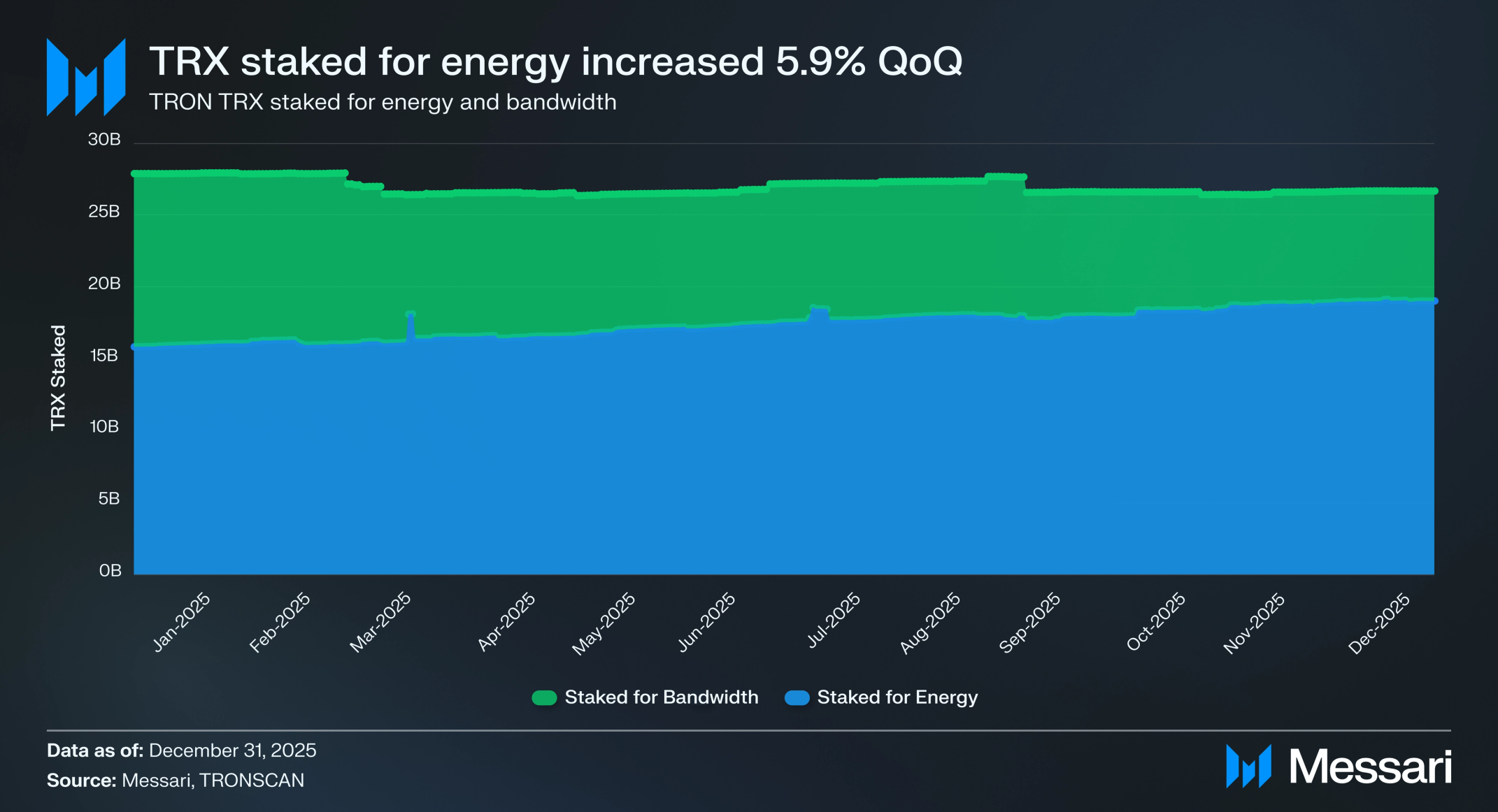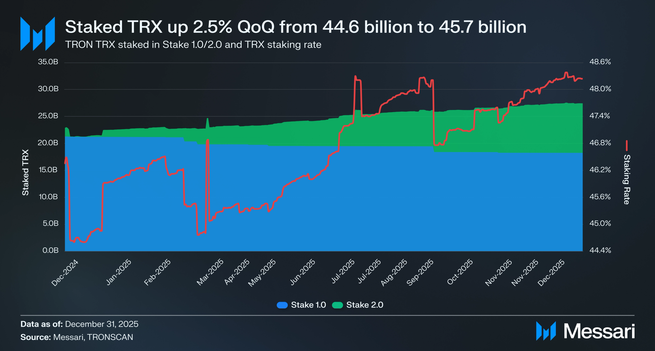 스테이킹 비율(총 공급량 중 활발하게 스테이킹된 TRX의 비율)은 4분기에 48.2%로 증가했다. 또한 더 많은 사용자가 4분기에 스테이크 2.0으로 계속 전환했다. 스테이크 2.0은 274억 TRX가 스테이킹된 상태로 분기를 마감했으며(전분기 대비 +4.8%), 스테이크 1.0은 182억 TRX가 스테이킹된 상태로 마감했다(전분기 대비 -0.8%). 총 457억 TRX가 4분기 말에 스테이킹되었으며, 이는 전분기 대비 2.5% 증가한 수치다. TRX의 가격은 하락했지만 스테이킹된 TRX 총량의 증가로 인해 달러 기준 총 스테이킹은 전분기 대비 2.7% 증가하여 147억 달러에서 151억 달러로 증가했다. 다른 지분증명(PoS) 네트워크와 비교할 때, 트론은 4분기 말까지 스테이킹된 자금의 달러 가치 기준으로 다섯 번째로 높았으며, 이전 분기에서 두 단계 상승했다.