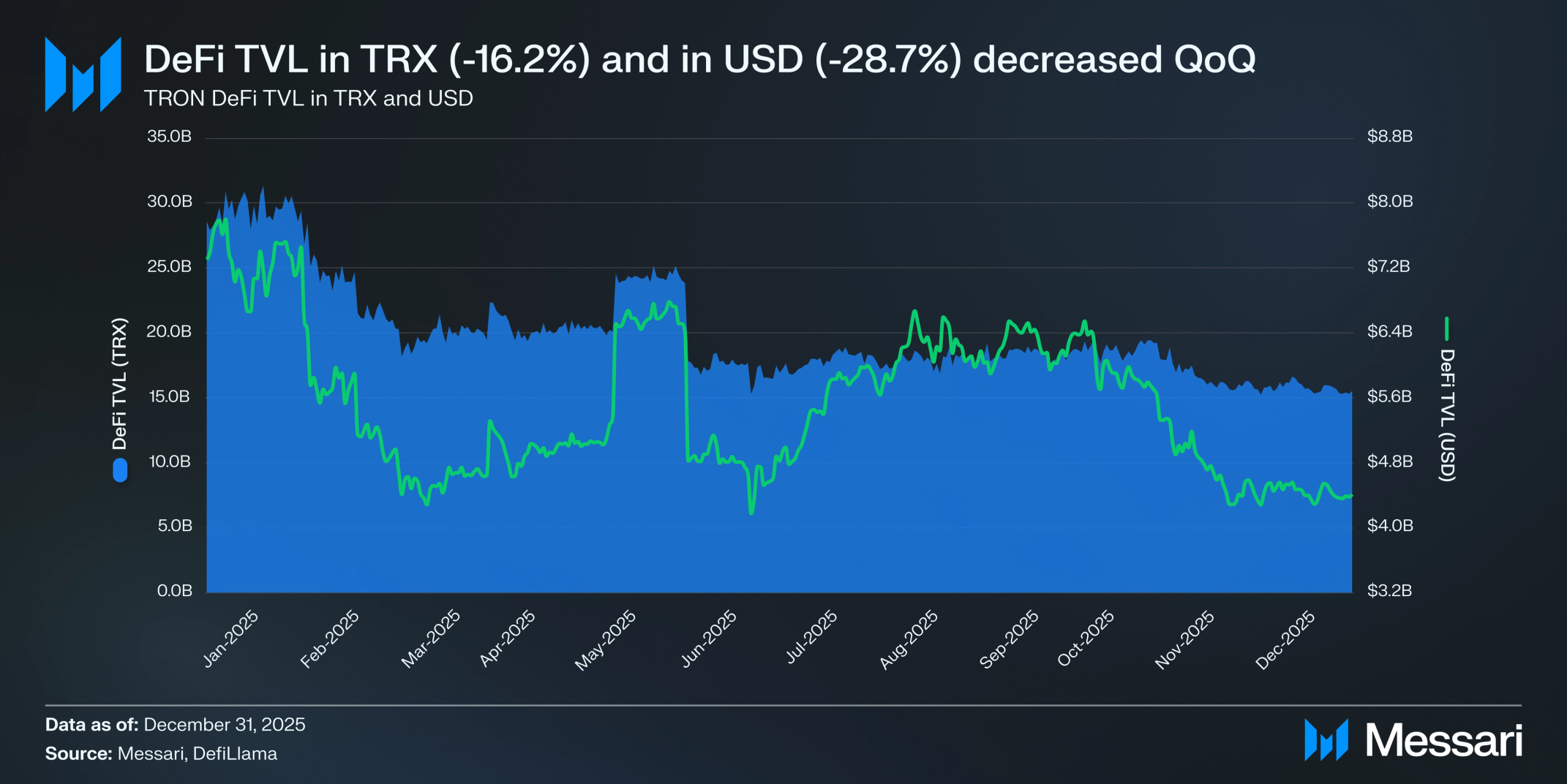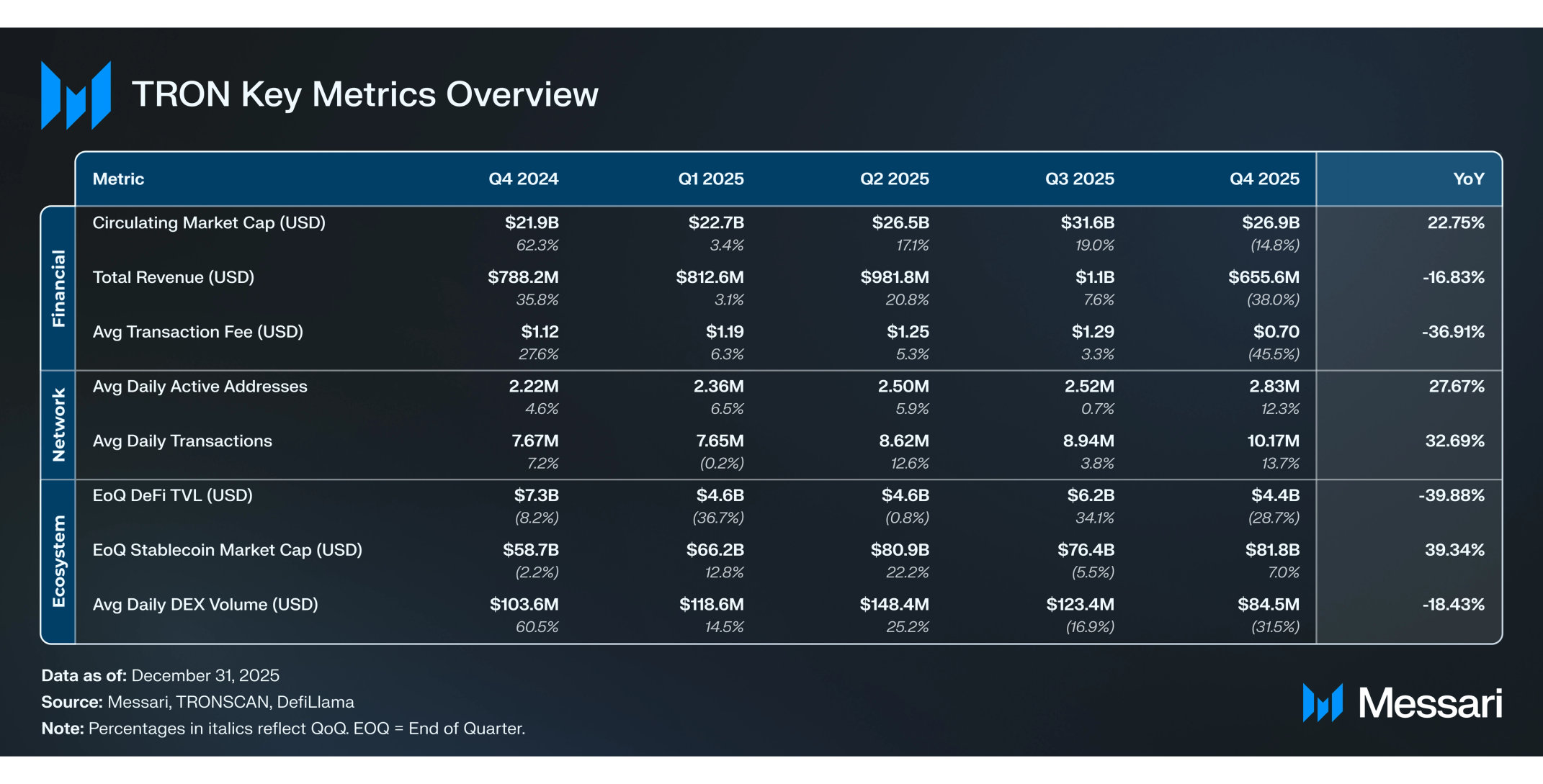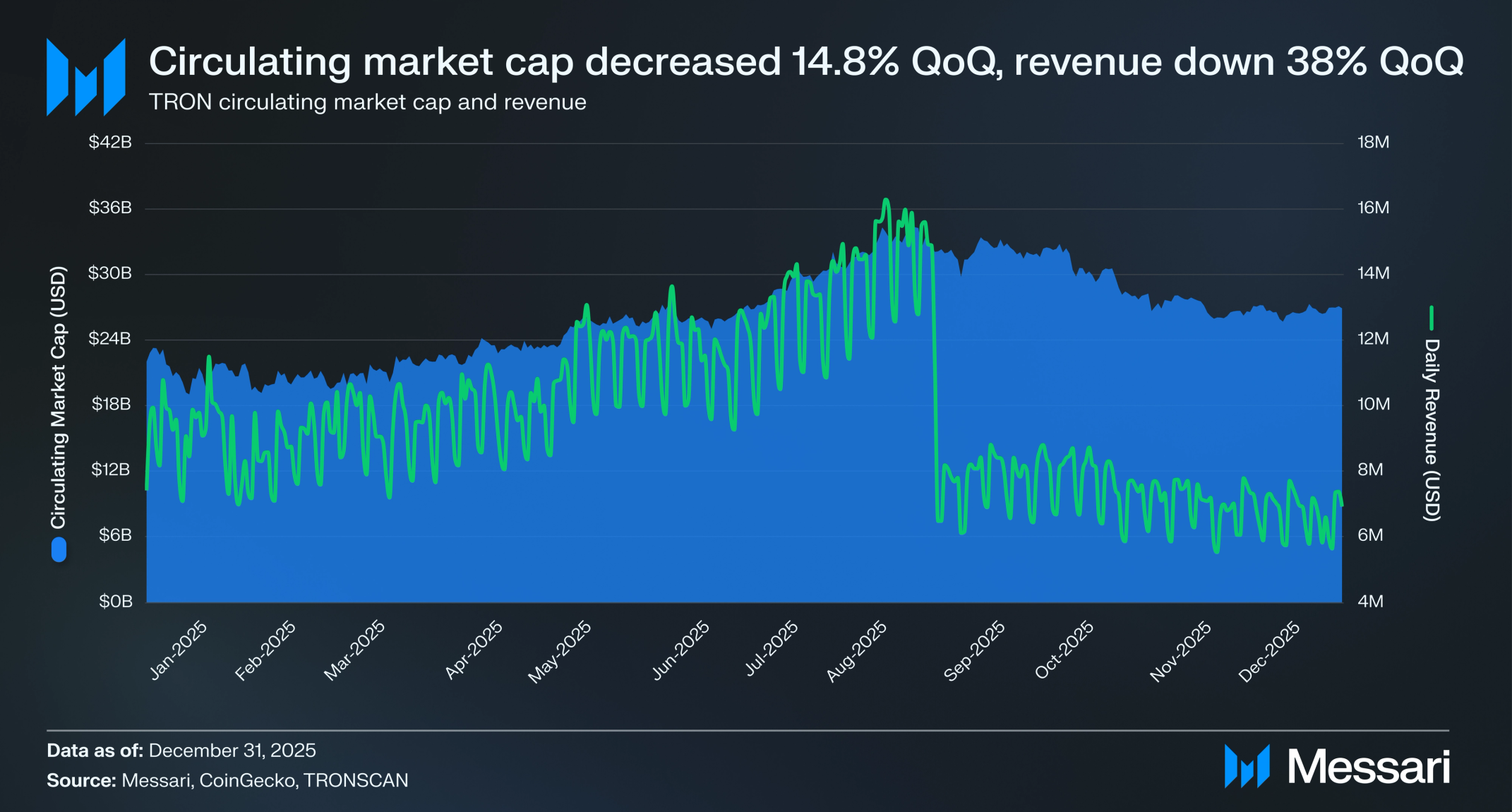 • 2025년 4분기 트론(TRON)은 수익 감소를 경험했으며, 이전 분기에 달성한 10억 달러 선 아래로 떨어졌다. 달러 기준 총 수익은 전분기 대비 38% 감소하여 11억 달러에서 6억 5,560만 달러로 하락했다.