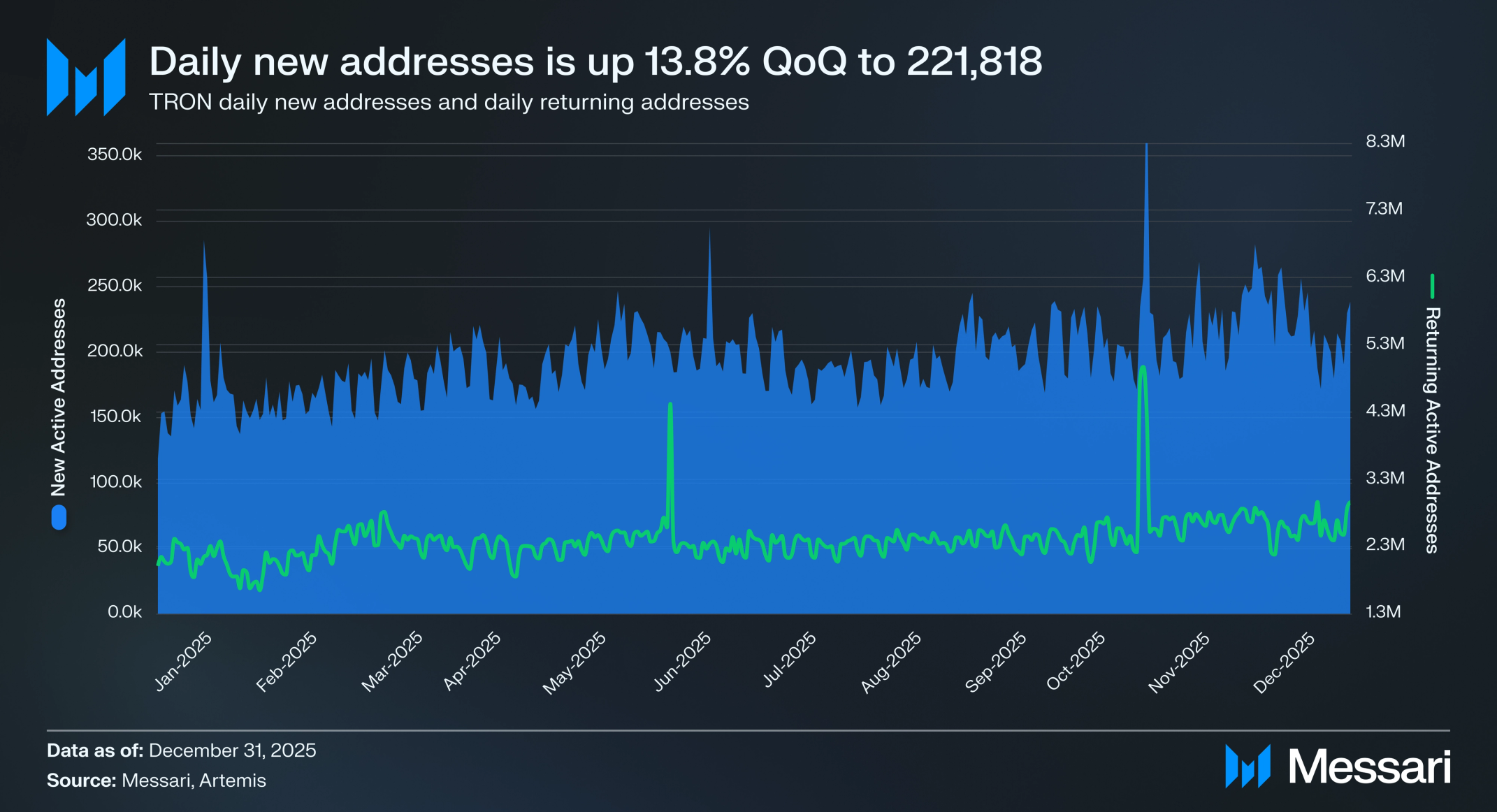 트론은 시가총액과 DeFi TVL이 약간 냉각되었음에도 불구하고 강력한 네트워크 활동과 중요한 기관 이정표와 함께 2025년을 마무리했다. 네트워크는 일평균 거래량이 1,000만 건을 넘어서고 활성 주소가 280만 개에 도달하여 사용량에서 주요 이정표를 달성했으며, 이는 깊은 사용자 참여를 나타낸다. 트론이 연속 두 번째 10억 달러 수익 분기를 달성하면서 재무 성과는 핵심 강점으로 남았다. 스테이블코인 부문은 새로운 성장을 경험했으며 818억 달러의 시가총액에 도달했고, 이는 USDT의 지속적인 지배력과 USD1 스테이블코인의 성공적인 첫 전체 분기에 의해 주도되었다. 또한 선펄프의 출시와 레볼루트, 렛저, 레이어제로를 통한 베이스와 같은 플랫폼과의 전략적 통합은 트론의 크로스체인 입지와 소매 접근성을 크게 확대했다.