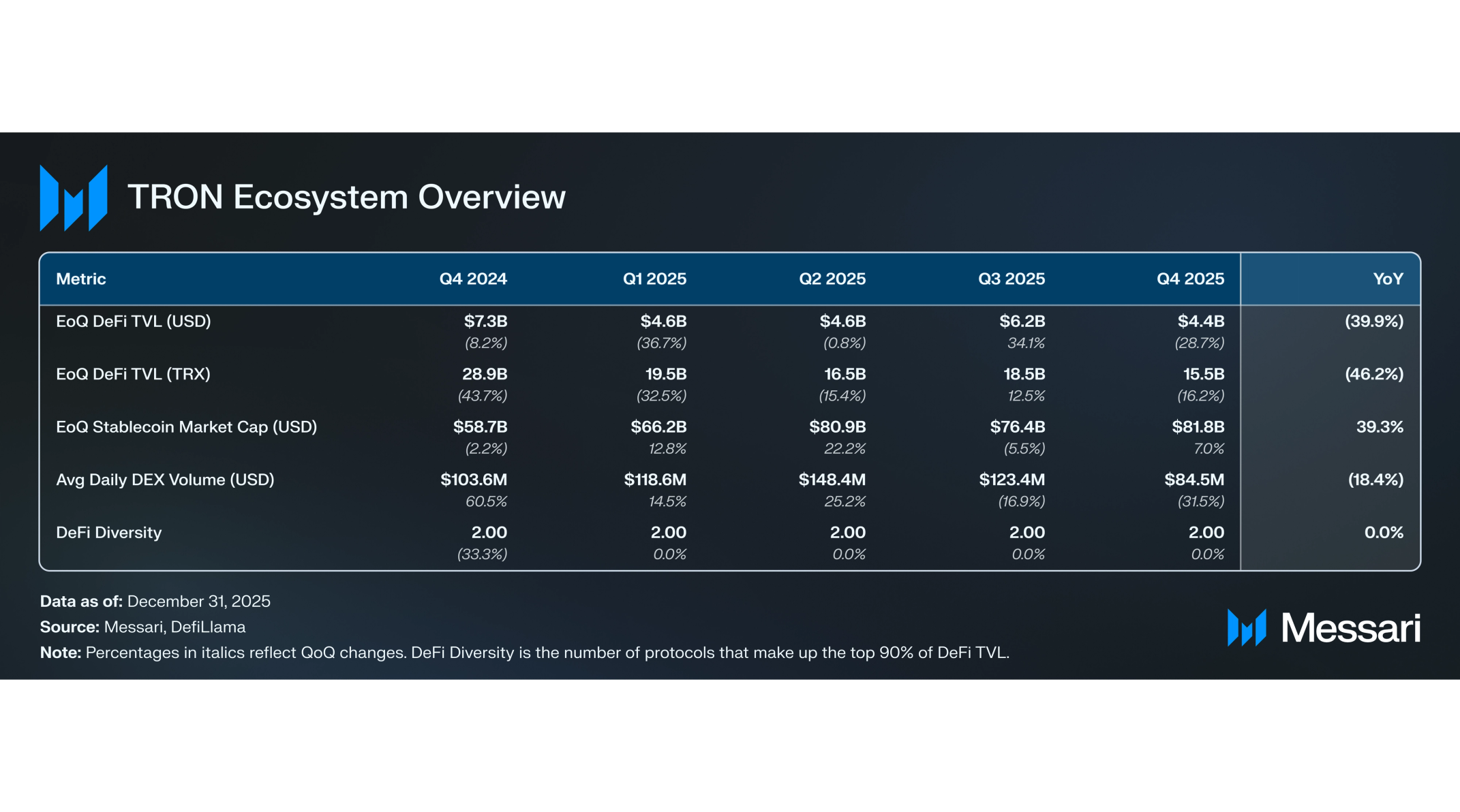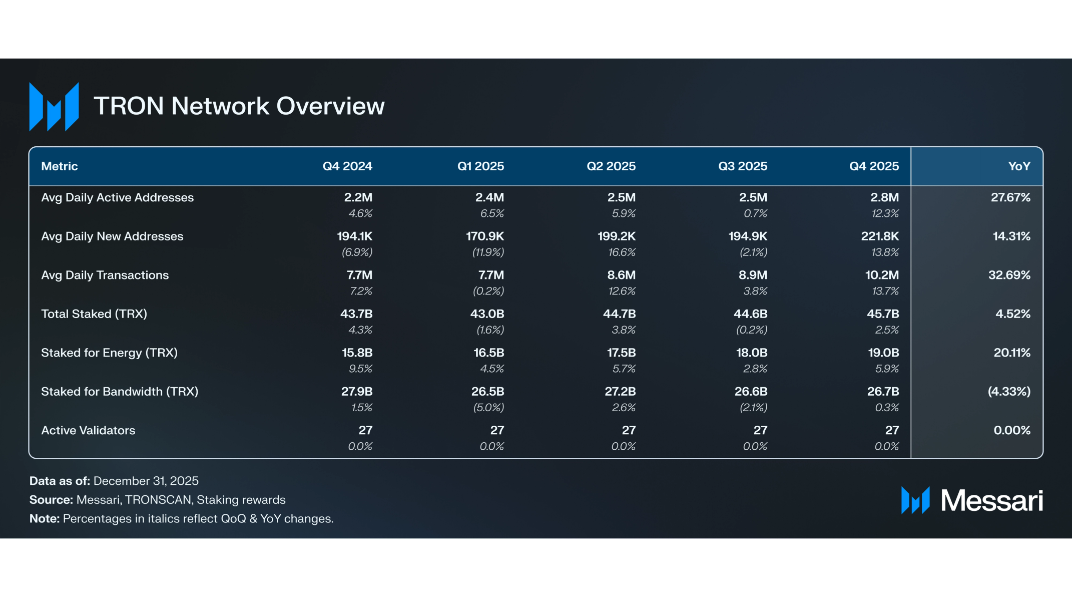 이 보고서는 트론 네트워크(Tron Network Limited)의 의뢰로 작성됐습니다. 모든 콘텐츠는 저자(들)에 의해 독립적으로 작성되었으며, Messari Inc. 또는 보고서를 의뢰한 기관의 의견을 반드시 반영하는 것은 아닙니다. 의뢰 기관이 보고서 내용에 일부 의견을 제시할 수 있으나, Messari는 데이터의 정확성과 객관성을 유지하기 위해 최종 편집권을 보유합니다. 또한, 저자(들)는 이 보고서에서 언급된 암호화폐를 보유하고 있을 수 있습니다.