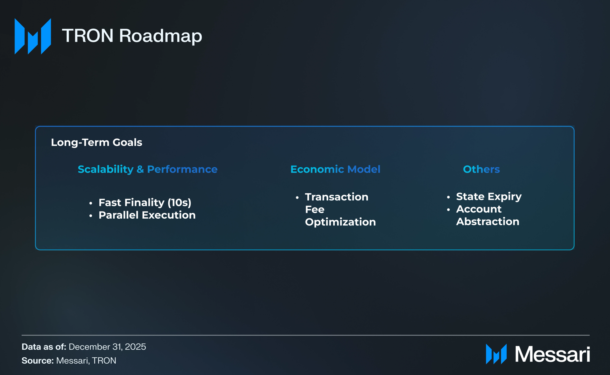 2026년으로 넘어가면서 트론은 P2P 토폴로지 견고성을 높여 네트워크 안정성을 강화하는 데 계속 집중할 예정이다. 동적 거래 수수료 조정과 같은 경제 모델 개선은 생태계의 지속 가능성을 강화하는 것을 목표로 한다. 장기적으로 트론은 계정 추상화(account abstraction) 및 상태 데이터 만료(state data expiration)와 같은 다른 영역을 탐색하여 강력한 인프라와 미래 적응성을 보장할 계획이다.