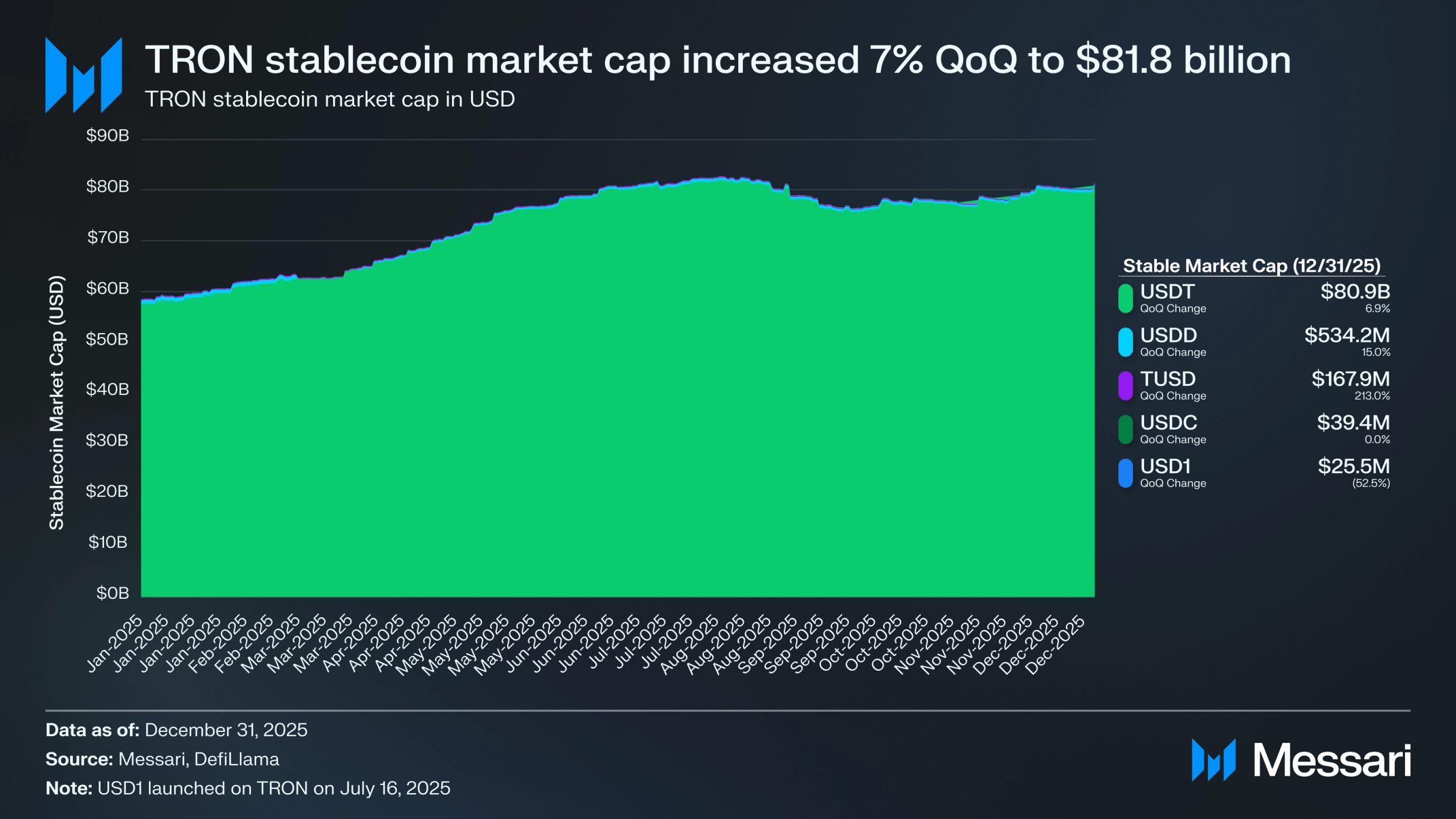 트론의 다른 스테이블코인도 4분기에 전분기 대비 증가했다. 두 번째로 큰 스테이블코인인 USDD는 전분기 대비 15.0% 증가하여 4억 6,470만 달러에서 5억 3,420만 달러로 증가했다. USDD는 스테이블코인을 보유한 계정이 457,493개(4분기에 +927 보유자)를 넘어서는 이정표를 달성했다. 2025년 7월 16일 월드 리버티 파이낸셜 USD(World Liberty Financial USD)인 USD1도 트론에서 출시되었으며, 이미 101,655명의 보유자(4분기에 +24,957 보유자)를 확보했다.