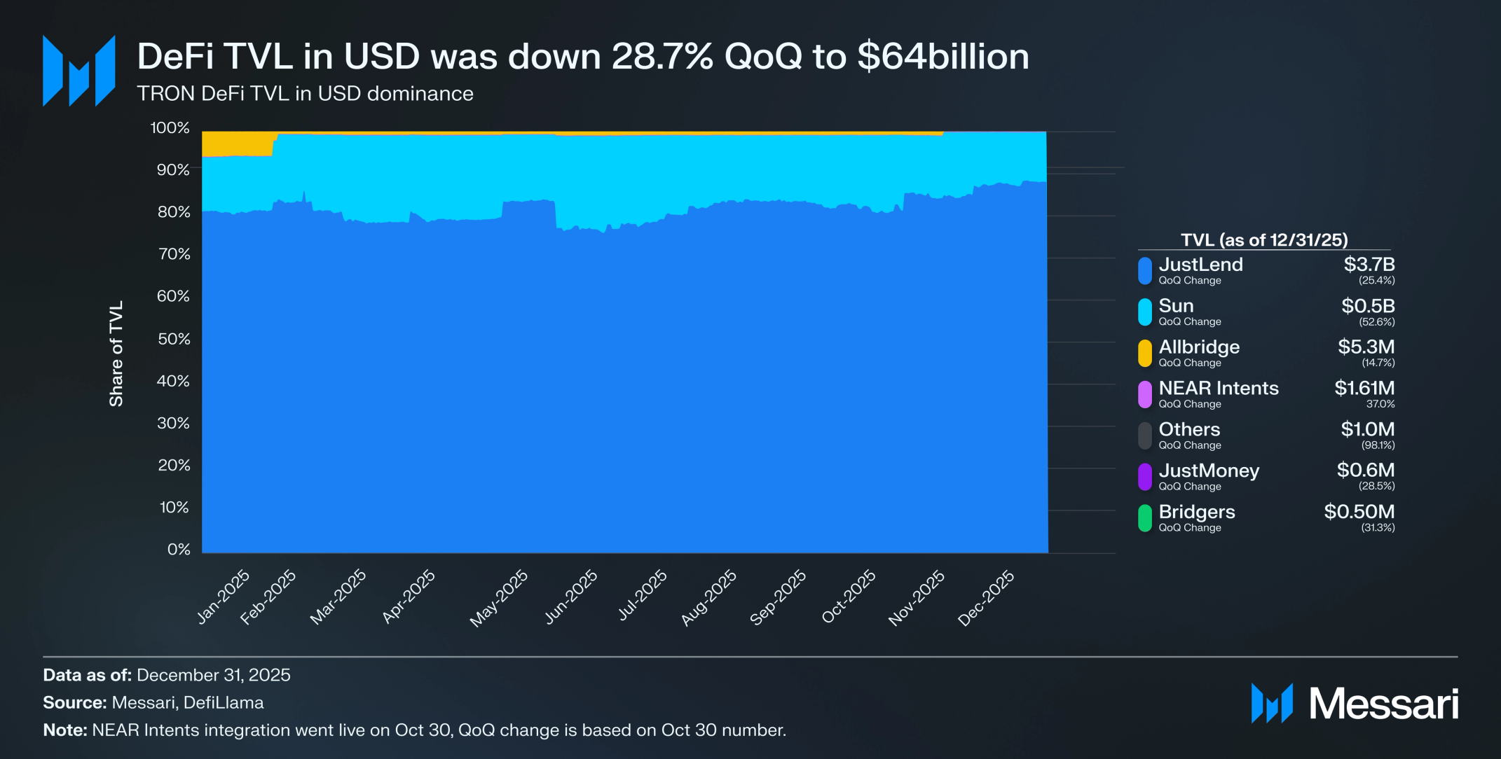 • 스테이블코인 생태계는 꾸준한 확장을 이어갔으며, 트론의 스테이블코인 시가총액은 전분기 대비 7.0% 증가한 818억 달러를 기록했다. USDT는 809억 달러의 시가총액으로 여전히 지배적인 자산이며, 네트워크 스테이블코인 공급량의 99% 이상을 차지한다.