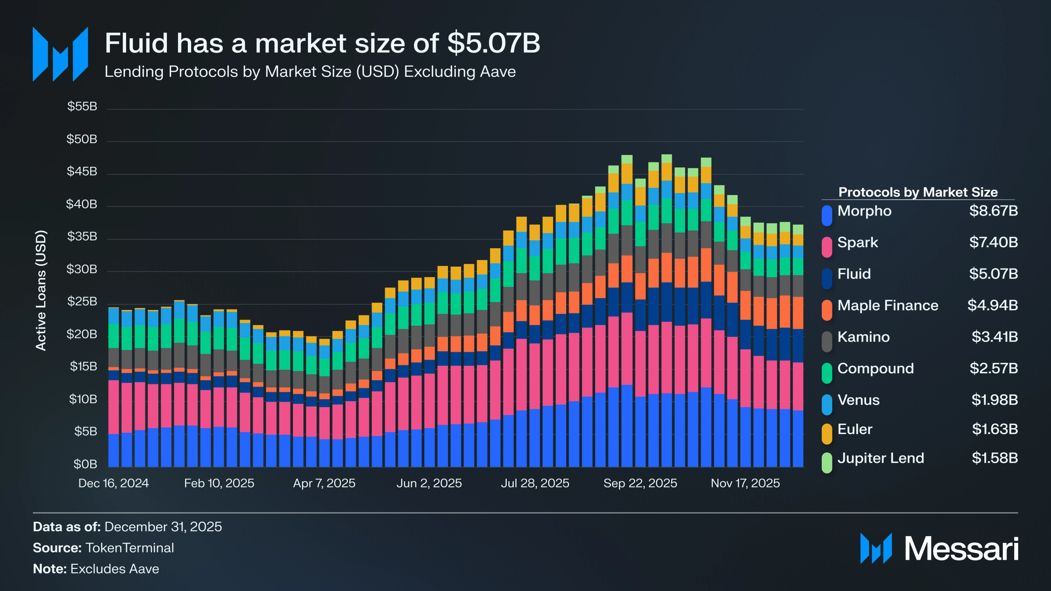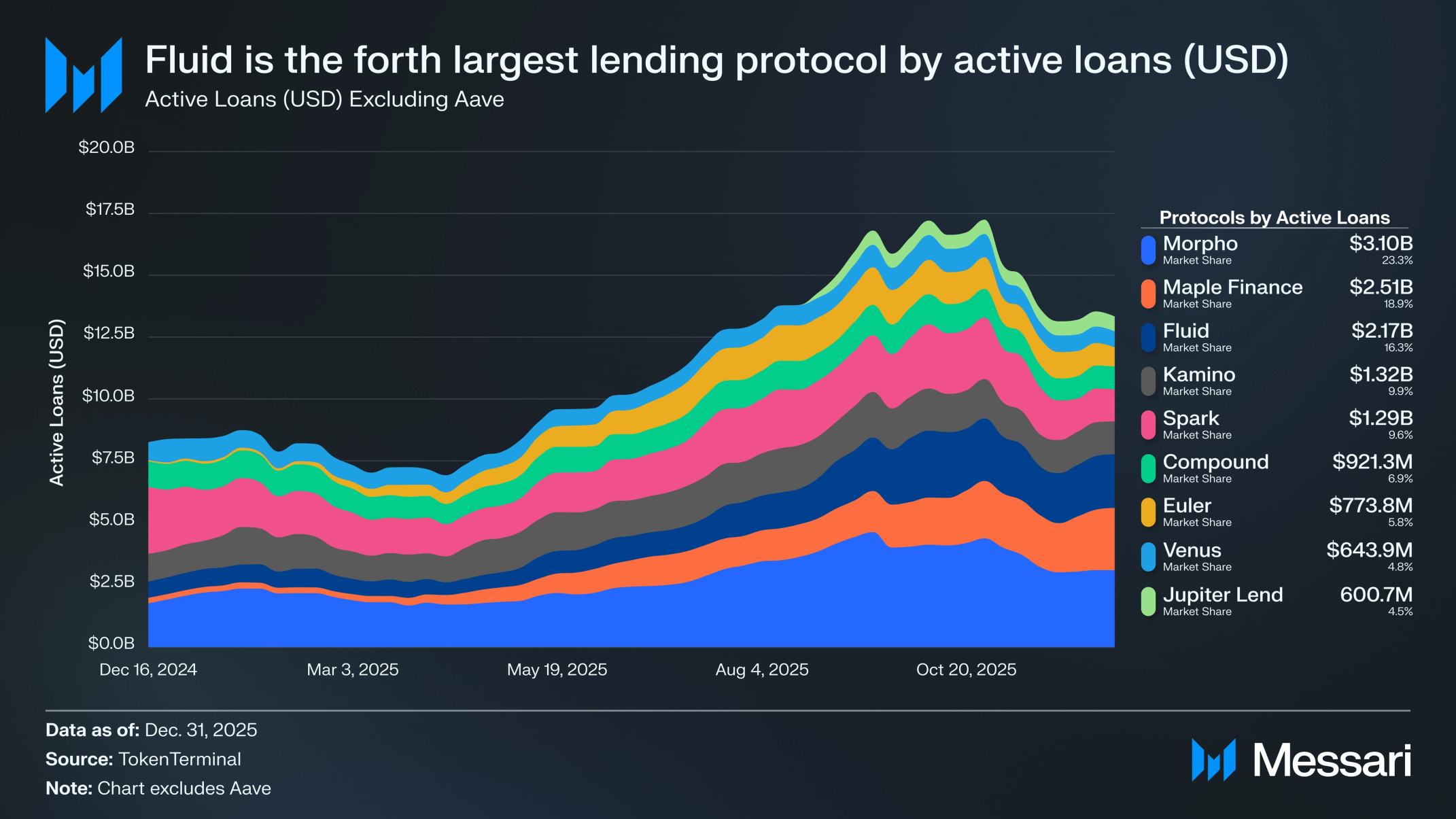 규모만으로는 대출 프로토콜이 얼마나 효과적으로 사용되고 있는지 포착하지 못한다. 활성 대출은 실제 수요에 대한 더 정확한 신호를 제공하며, 예치된 자본 중 얼마나 많은 양이 유휴 상태로 남아 있지 않고 실제로 차입되는지 측정한다. 이 지표에서 플루이드의 배포는 주피터 렌드를 포함하여 전체 4위를 차지하며 2025년을 21억 7천만 달러의 활성 대출로 마무리했다.