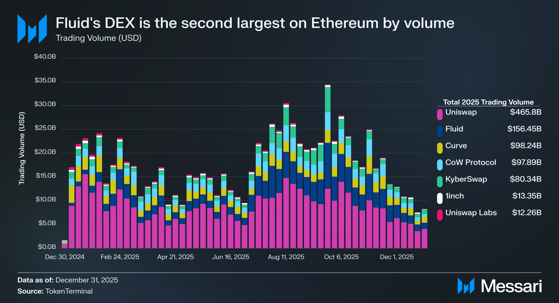플루이드 DEX는 2025년 이더리움(Ethereum)에서 거래량 기준 두 번째로 큰 DEX로 마무리했으며, 연간 1,564억 5천만 달러의 거래량을 처리했다. 이는 스마트 담보(Smart Collateral)와 스마트 부채(Smart Debt) 모델이 기존 AMM의 확장 가능한 대안임을 입증했다.