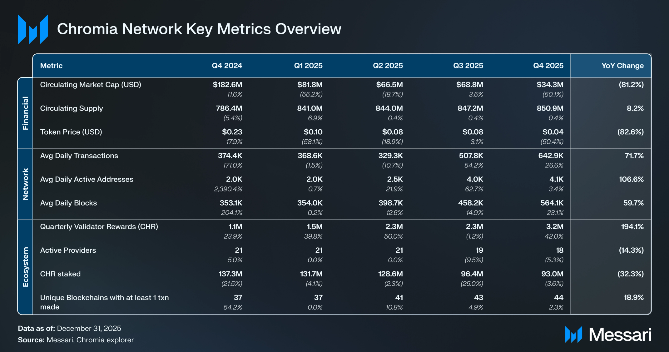 CHR는 2025년 4분기를 유통 시가총액 3,430만 달러로 마감했으며, 이는 6,880만 달러에서 전분기 대비 50.1% 감소한 수치다. 이러한 움직임은 광범위한 매도세 속에서 발생했으며, 암호화폐의 총 시가총액은 전분기 대비 4조 달러에서 2조 9,000억 달러로 27.5% 하락했다. CHR는 4분기를 0.04 달러로 마감했으며 유통 공급량은 8억 4,720만 개에서 8억 5,090만 개로 0.4% 증가했다.