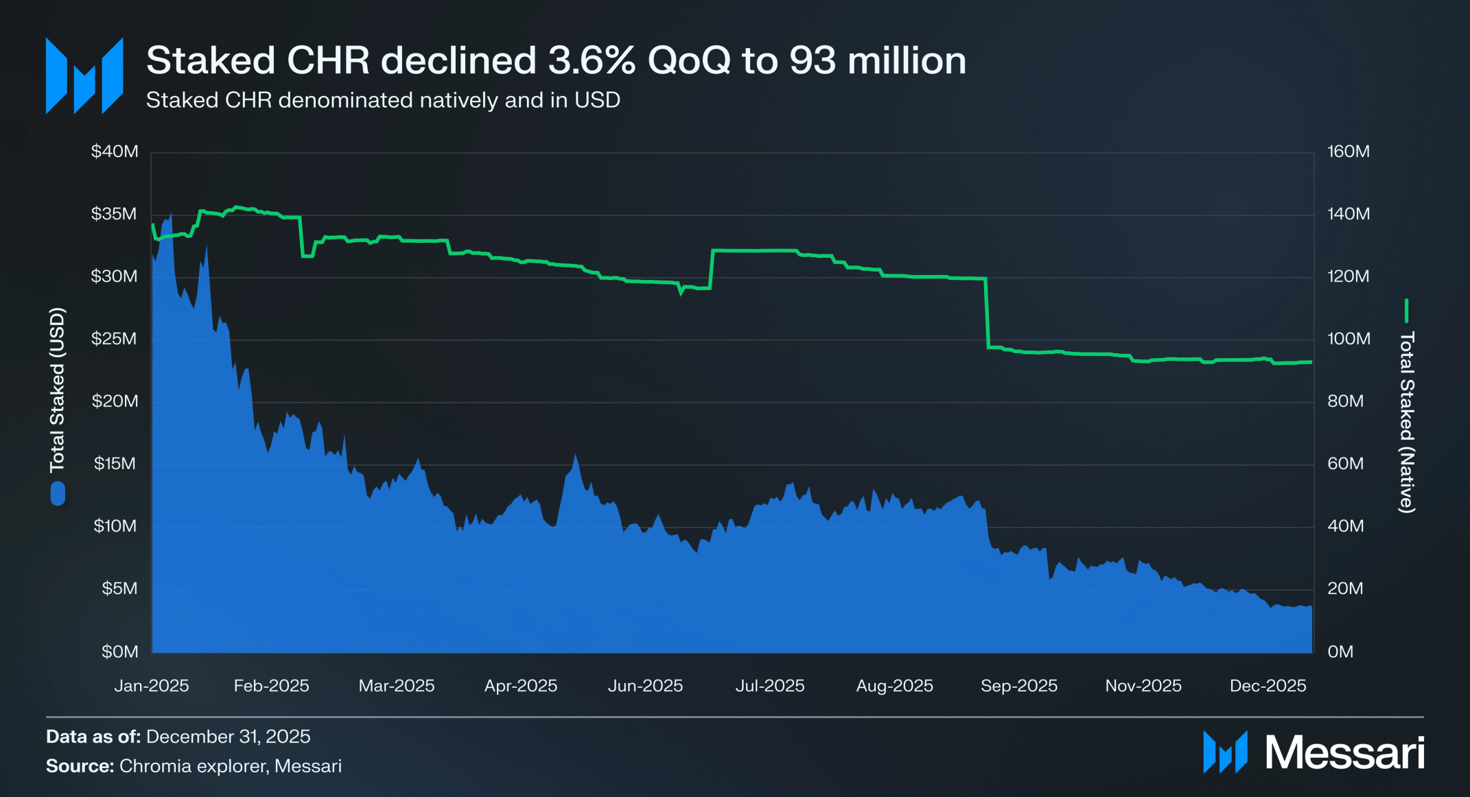 스테이킹 활동은 4분기에 안정적으로 유지되었으며 분기는 9,300만 CHR이 스테이킹된 상태로 종료되었다(전분기 대비 -3.6%). 달러 기준으로 스테이킹된 CHR의 가치는 780만 달러에서 380만 달러로 하락했으며, 이는 CHR 가격 하락으로 인한 전분기 대비 52.1% 감소다.