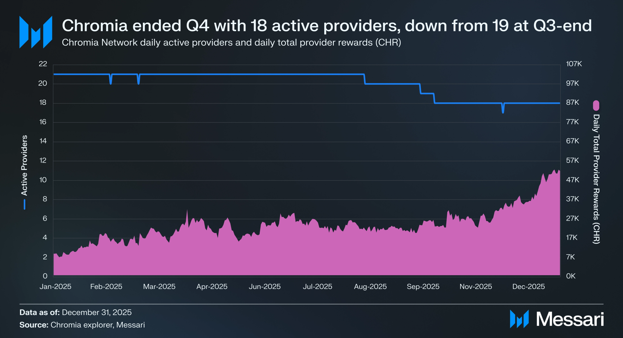4분기 말 기준 크로미아는 18명의 활성 제공자를 보유했으며, 이는 2025년 3분기 말 19명에서 전분기 대비 5.3% 감소한 수치다. 제공자 보상은 4분기에 총 320만 CHR로 3분기 230만 CHR에서 전분기 대비 42% 증가했다. 게임, DeFi, AI 애플리케이션 전반의 사용량 지속적 성장은 새로운 제공자가 크로미아 생태계에 합류하는 직접적인 촉매제다. 애플리케이션별 블록체인과 총 트랜잭션 처리량의 성장은 크로미아에서 검증자 용량에 대한 수요를 증가시키며, 이는 애플리케이션 체인을 보호하고 실행하는 제공자 노드를 실행하는 운영자에 의해 제공된다.