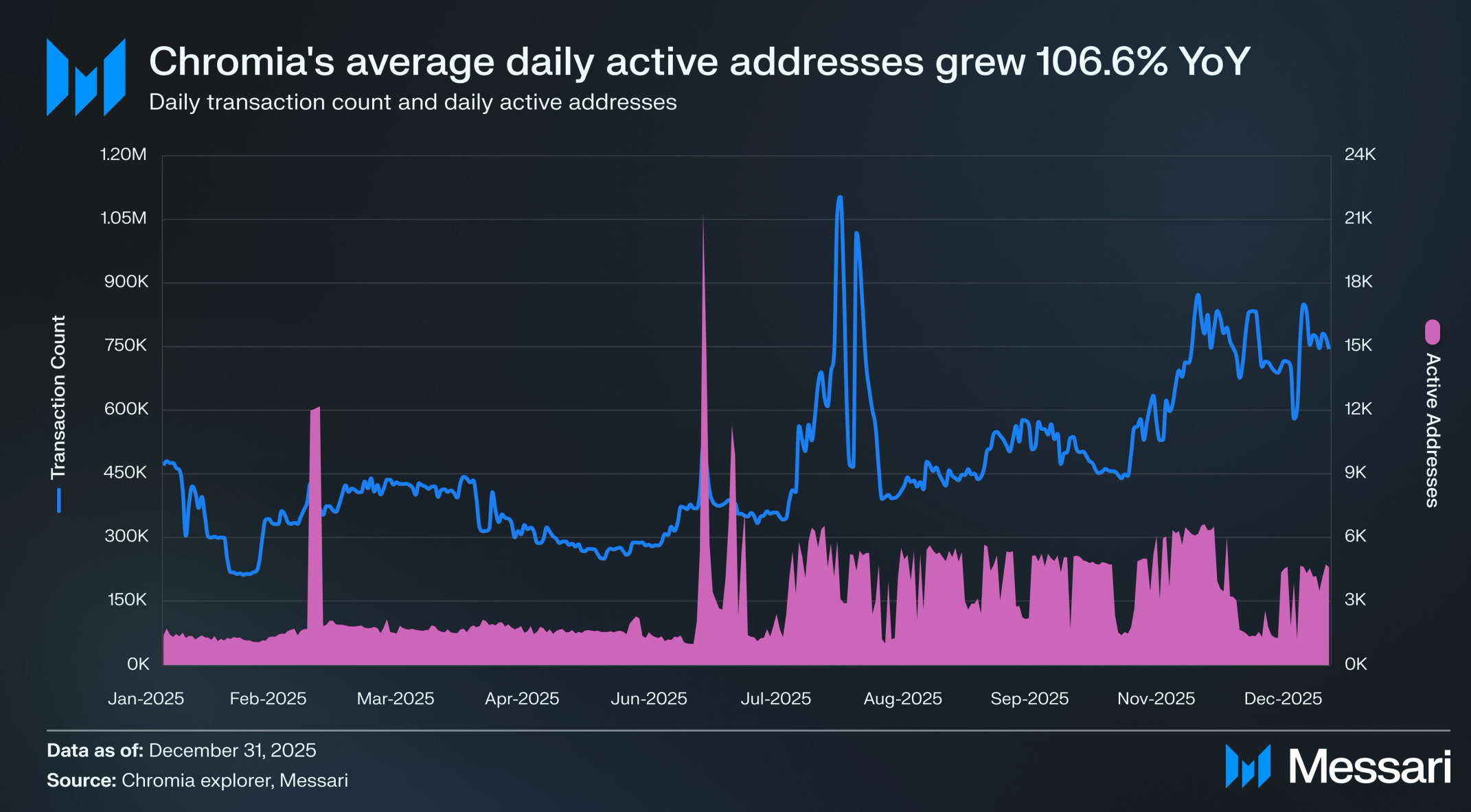 DNC: 2025년 6월 출시된 전용 고처리량 애플리케이션 체인으로 크로미아의 애플리케이션 레이어 처리량의 가장 큰 원천 중 하나로 남아 있다. DNC의 일평균 트랜잭션은 전분기 대비 1.4% 감소했으며, 2025년 3분기 11만 5,840건에서 2025년 4분기 11만 4,170건으로 감소했다.