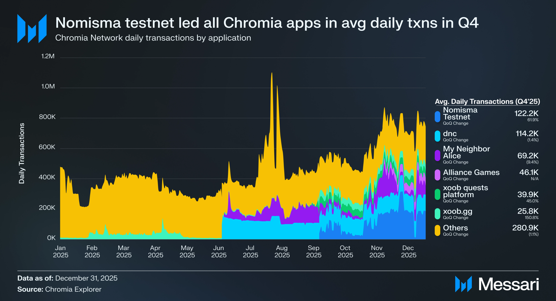 노미스마 테스트넷(Nomisma Testnet): 크로미아 서브체인으로 구축 중인 AI 기반 DeFi 플랫폼으로, 크로미아의 관계형 실행 환경을 사용하여 온체인 마찰을 줄이고 더 데이터 집약적인 DeFi 워크플로우를 가능하게 하도록 설계되었다. 노미스마 테스트넷은 2025년 4분기에 하루 평균 12만 2,150건의 트랜잭션을 기록했으며, 이는 2025년 3분기 7만 5,470건에서 전분기 대비 61.9% 증가한 수치다.