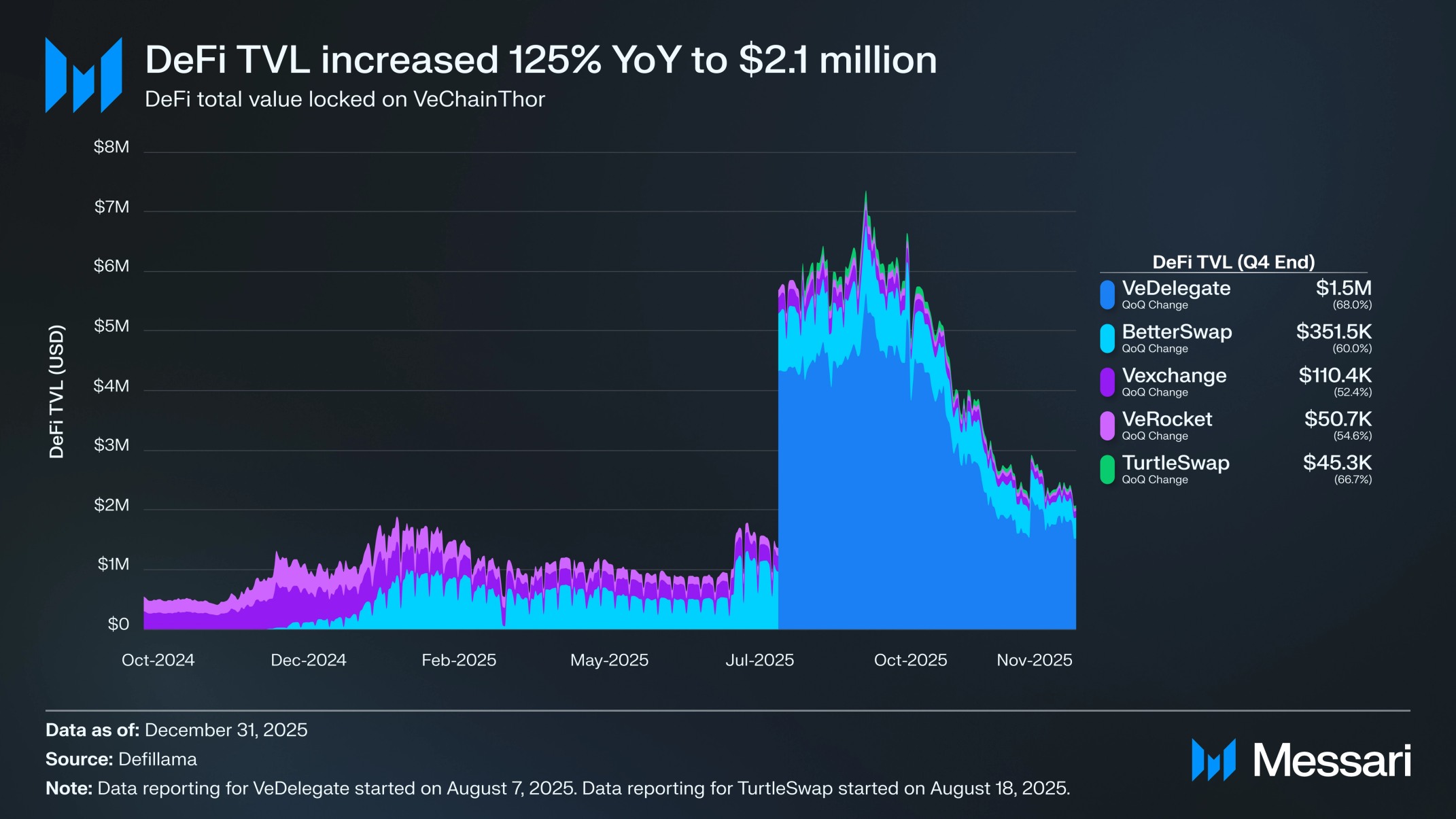 비체인Thor의 DeFi 생태계는 이전 분기의 급속한 확장 이후 2025년 4분기에 위축되었다. 총 예치 가치는 전분기 대비 66% 감소한 210만 달러를 기록했으며, 이는 3분기 말의 610만 달러에서 하락한 수치다. 베델리게이트(VeDelegate)는 전체 시장 점유율의 73.2%로 TVL 기준 가장 큰 프로토콜로 남아 있었지만 전분기 대비 68.0% 감소한 150만 달러를 기록했다. 그러나 전년 대비로 DeFi 부문은 확장을 유지했으며, 총 TVL은 2024년 4분기와 비교하여 124.9% 증가했다.
