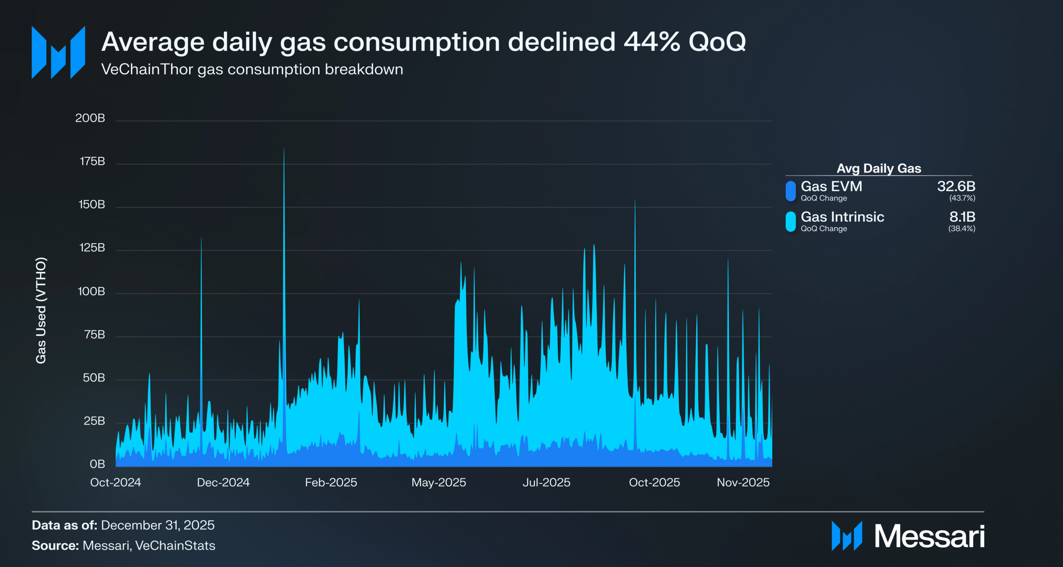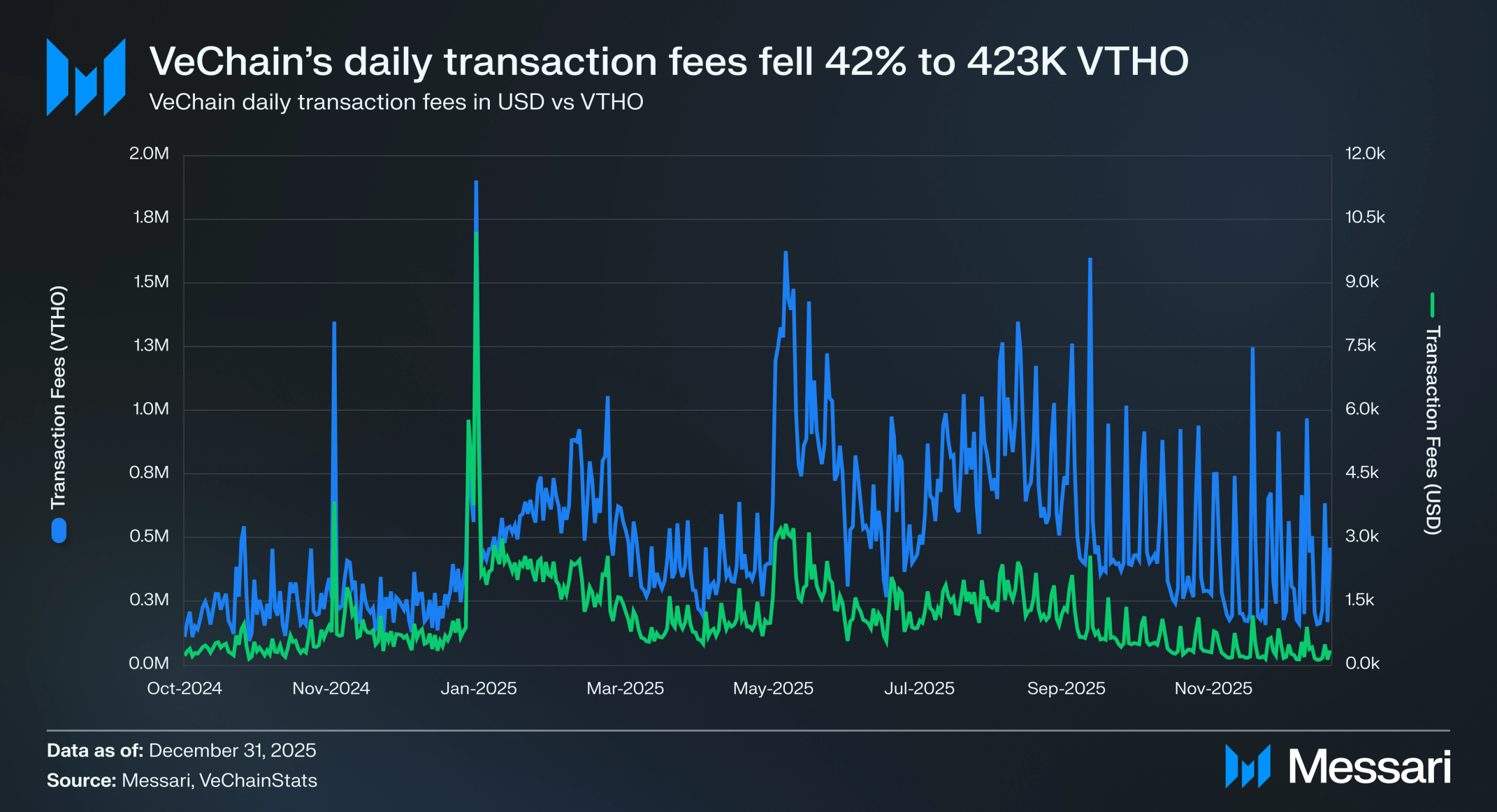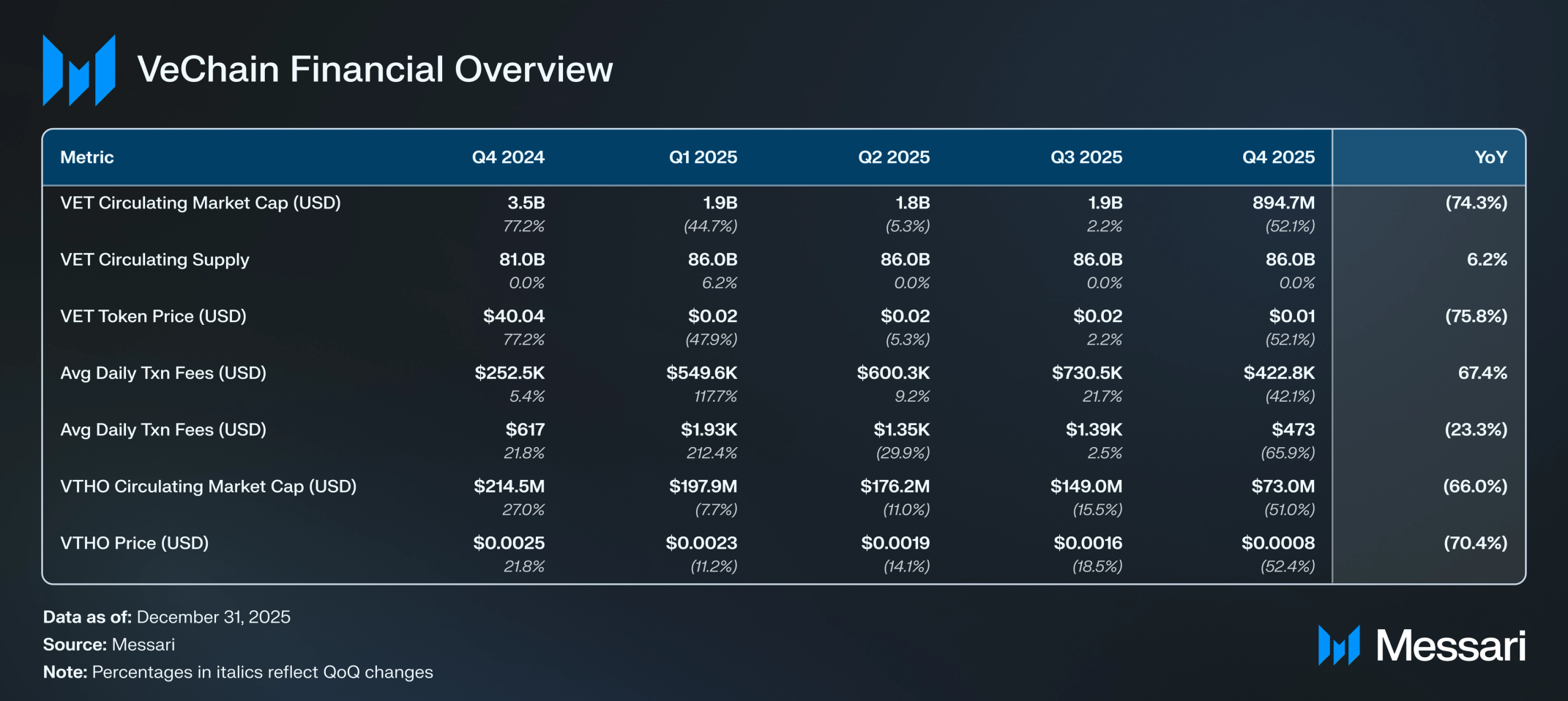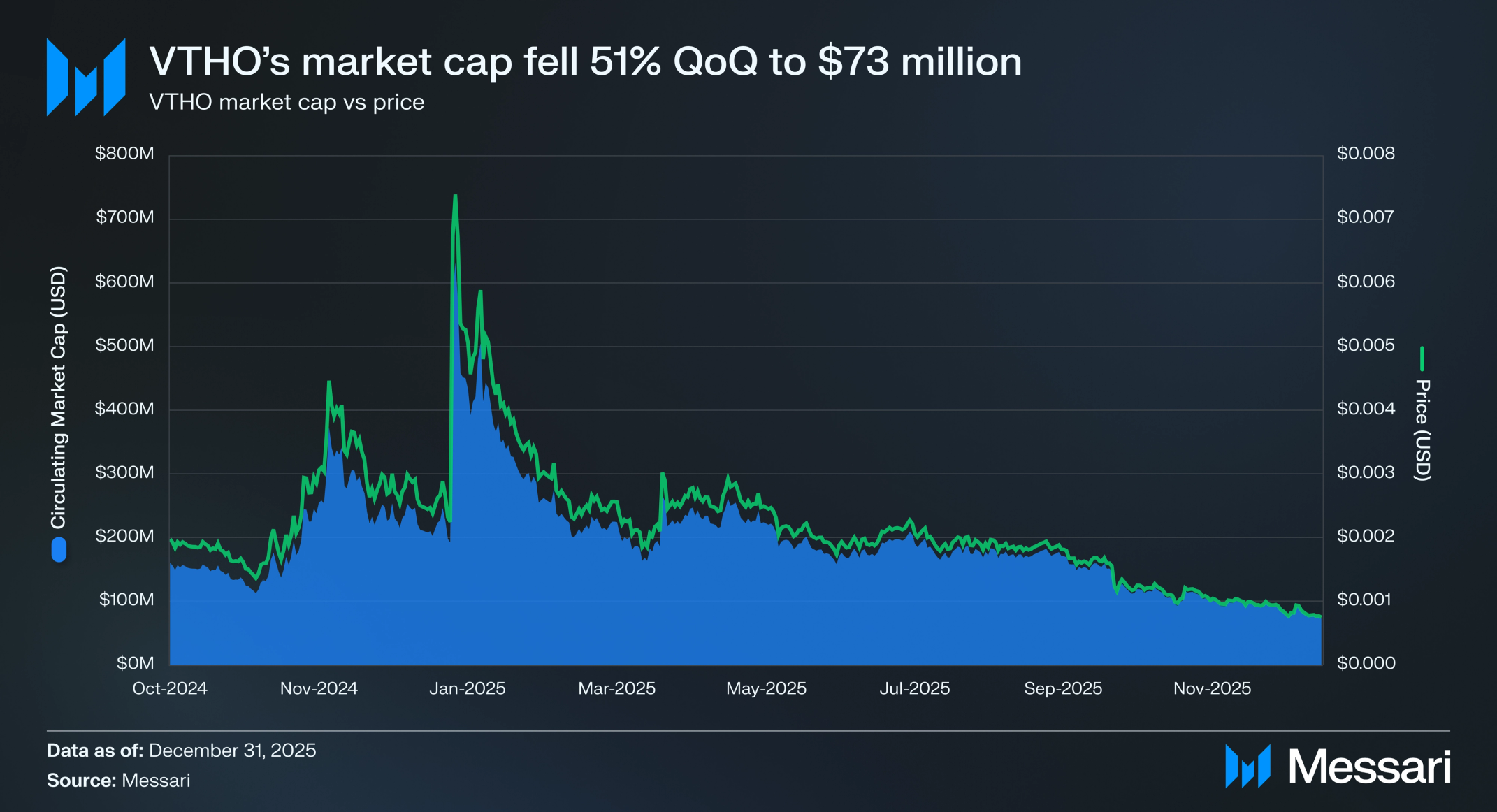 스테이킹 보상을 통해 획득되는 비체인Thor의 가스 토큰인 VTHO는 2025년 4분기에 위축되었다. 총 시가총액은 전분기 대비 51.0% 감소한 7,300만 달러를 기록했으며, 이는 3분기의 1억 4,880만 달러에서 하락한 수치다. VTHO의 가격은 유사한 비율로 하락하여 전분기의 0.00158달러에서 전분기 대비 52.4% 감소한 0.00075달러를 기록했다.