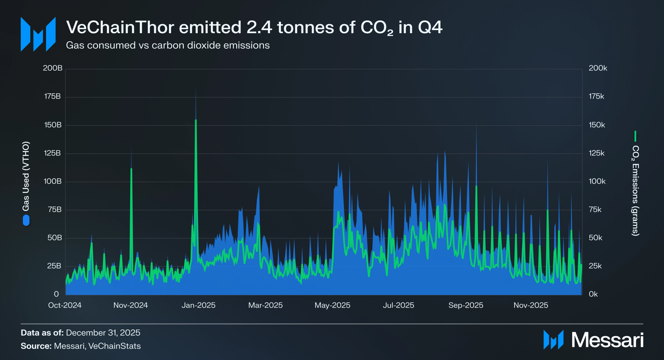 비체인Thor의 CO₂ 배출량은 2025년 4분기에 감소했다. 네트워크는 분기 동안 추정 2.4톤의 CO₂를 배출했으며, 이는 3분기 대비 41.8% 감소한 수치로 약 269갤런의 휘발유 소비의 연간 에너지 사용량과 대략 동일하다.