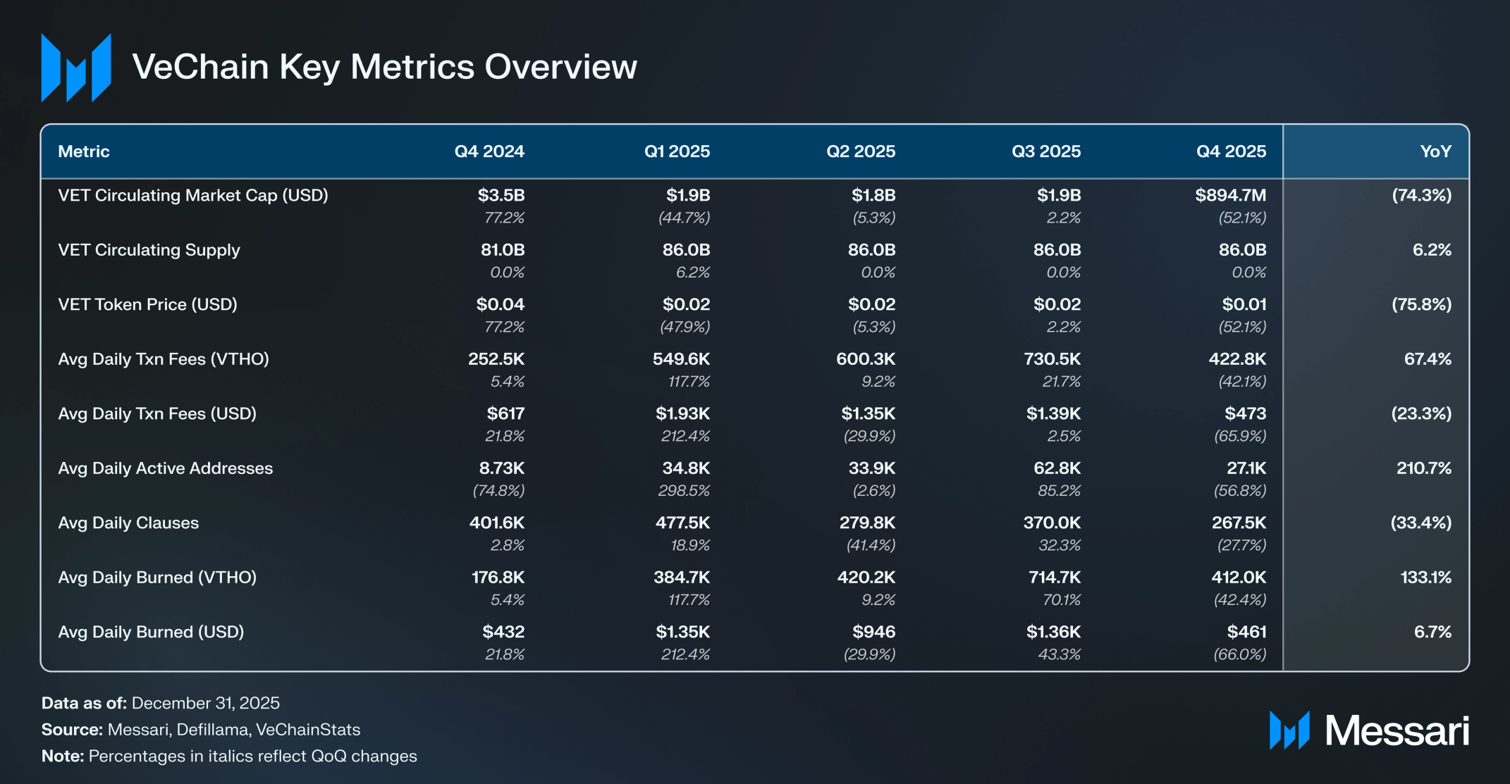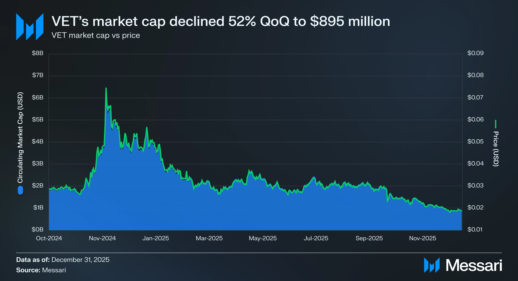 VET의 시가총액은 2025년 4분기에 전분기 대비 52.1% 하락하여 19억 달러에서 8억 9,470만 달러로 감소했다. 토큰 가격도 이러한 하락을 반영하여 분기를 0.010달러로 마감했으며, 이는 3분기의 0.022달러에서 52.1% 하락한 수치다. 그 결과 VET는 모든 암호화폐와 비교하여 시가총액 기준으로 63번째로 큰 자산으로 분기를 마감했다.