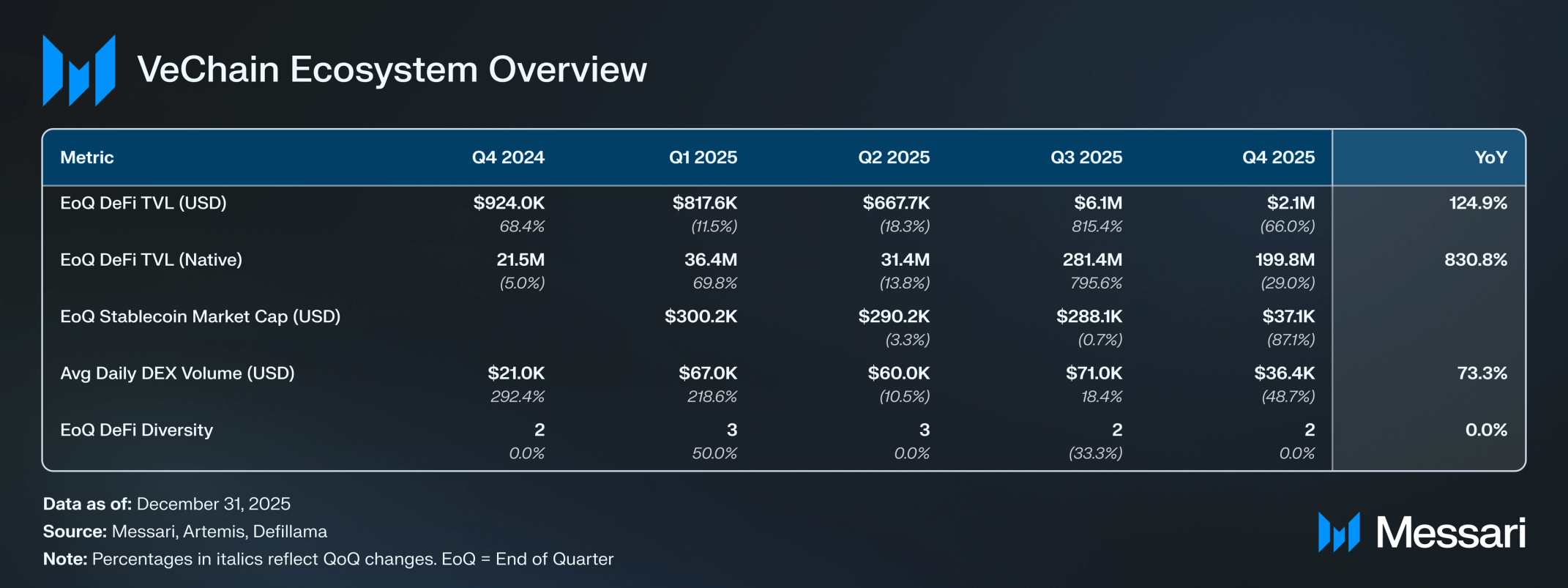 • VET의 시가총액은 시장 여건 약화 속에서 전분기 대비 52.1% 감소한 8억 9,470만 달러를 기록했으며, VTHO의 시가총액은 전분기 대비 51.0% 하락한 7,300만 달러를 기록했다.