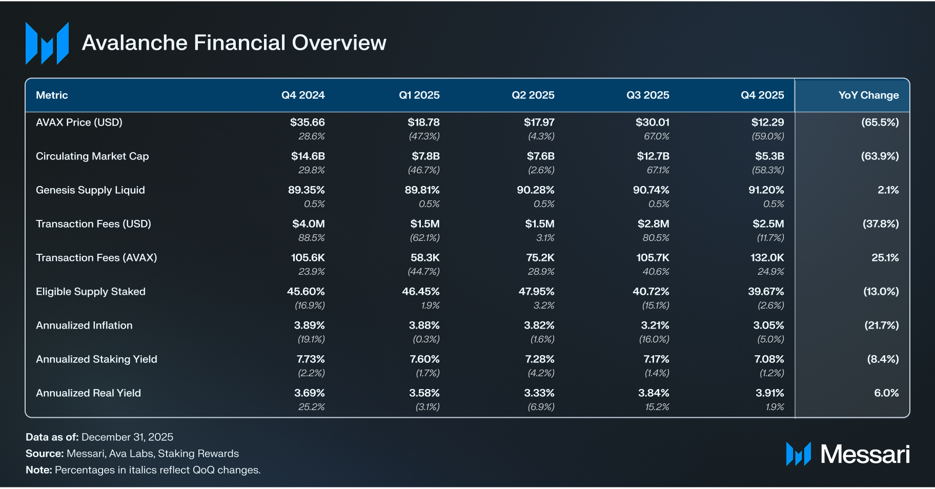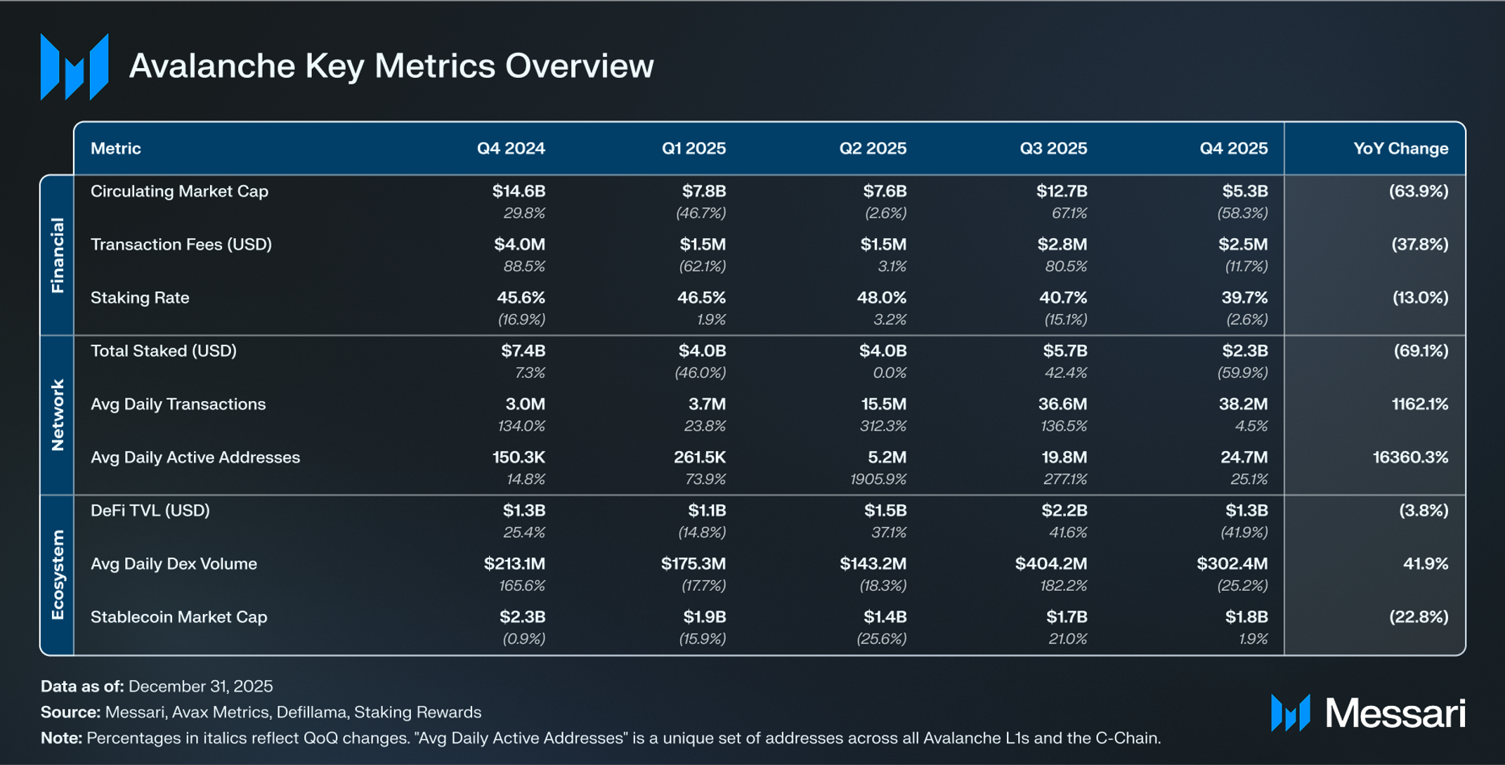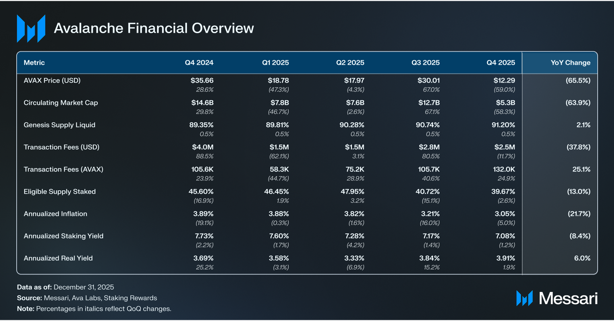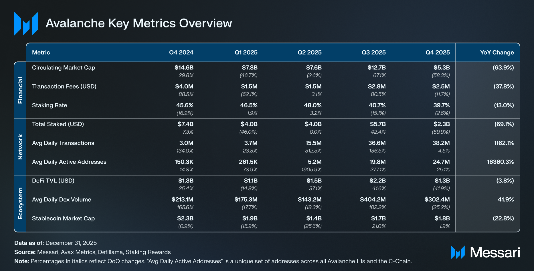 AVAX는 QoQ 59.0%, YoY 65.5% 하락하여 9월 Q3 말 30.0 달러에서 Q4 말 12.3 달러로 떨어졌다. 유통 시가총액은 지난 분기 동안 QoQ 58.3%, YoY 63.9% 감소하여 127억 달러에서 53억 달러로 하락했다. 이 하락은 Q3의 성장 기간 이후 발생했으며 2025년 마지막 몇 개월 동안의 광범위한 시장 변동성을 반영한다.
