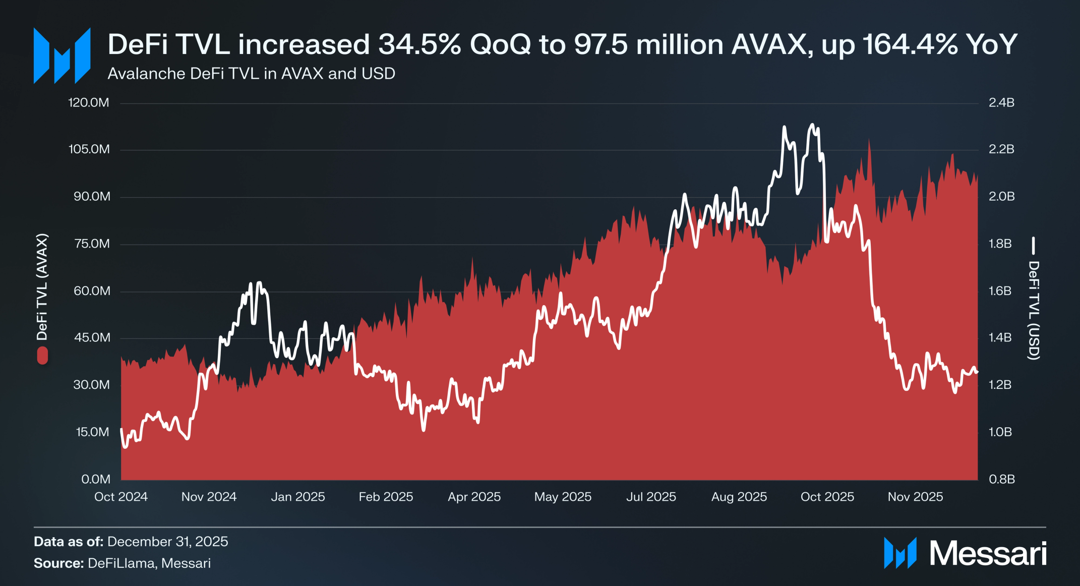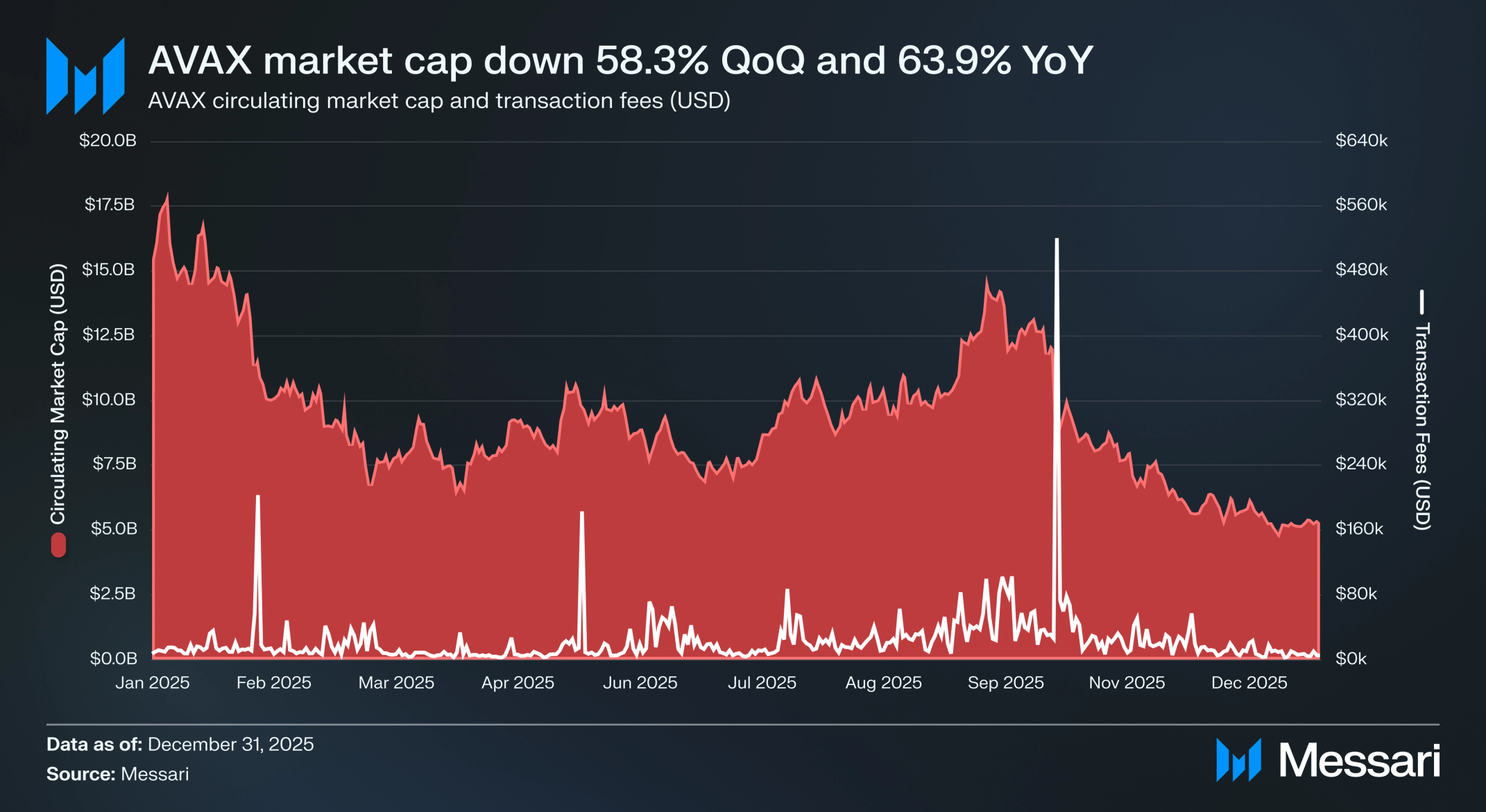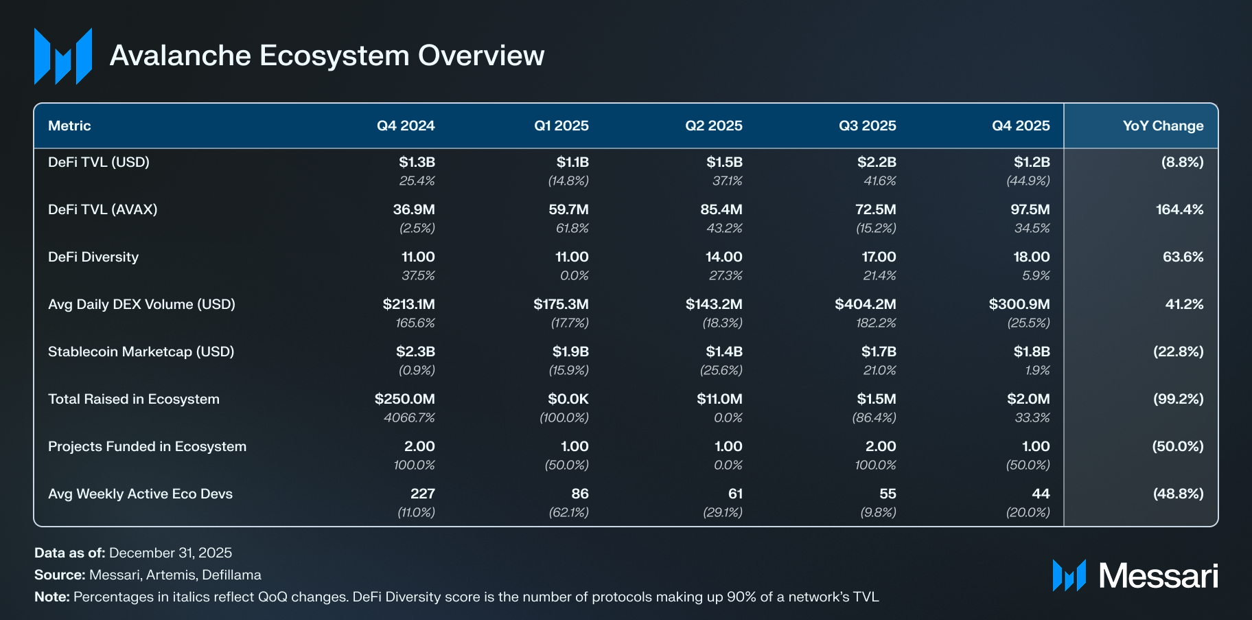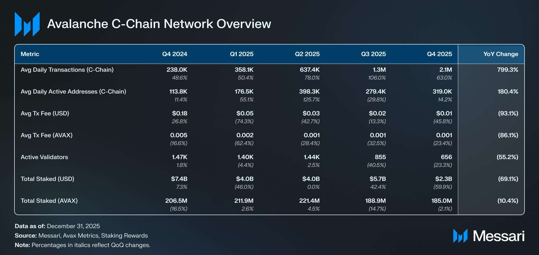 AVAX는 QoQ 59.0%, YoY 65.5% 하락하여 9월 Q3 말 30.0 달러에서 Q4 말 12.3 달러로 떨어졌다. 유통 시가총액은 지난 분기 동안 QoQ 58.3%, YoY 63.9% 감소하여 127억 달러에서 53억 달러로 하락했다. 이 하락은 Q3의 성장 기간 이후 발생했으며 2025년 마지막 몇 개월 동안의 광범위한 시장 변동성을 반영한다.