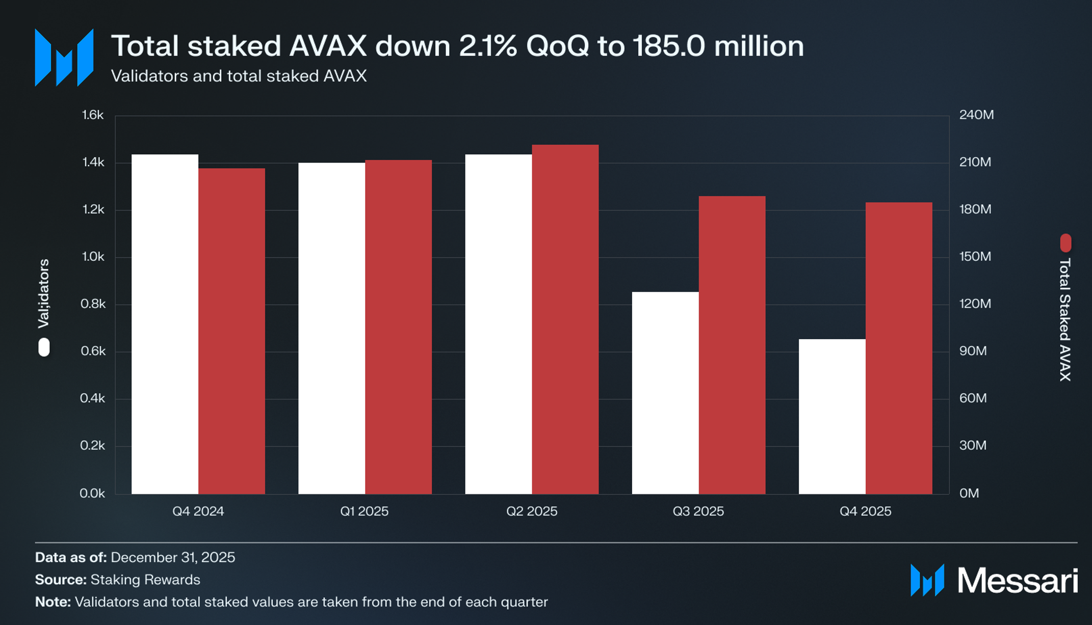 2025년 Q4 말 기준, 활성 검증자 수는 QoQ 23.3%, YoY 55.2% 감소하여 855개에서 656개로 떨어졌다. 총 스테이킹된 AVAX도 감소하여 QoQ 2.6%, YoY 10.4% 하락하여 1억 8,500만 개가 되었다. 검증자 참여는 2024년에 기록된 수준에서 계속 후퇴했다.
